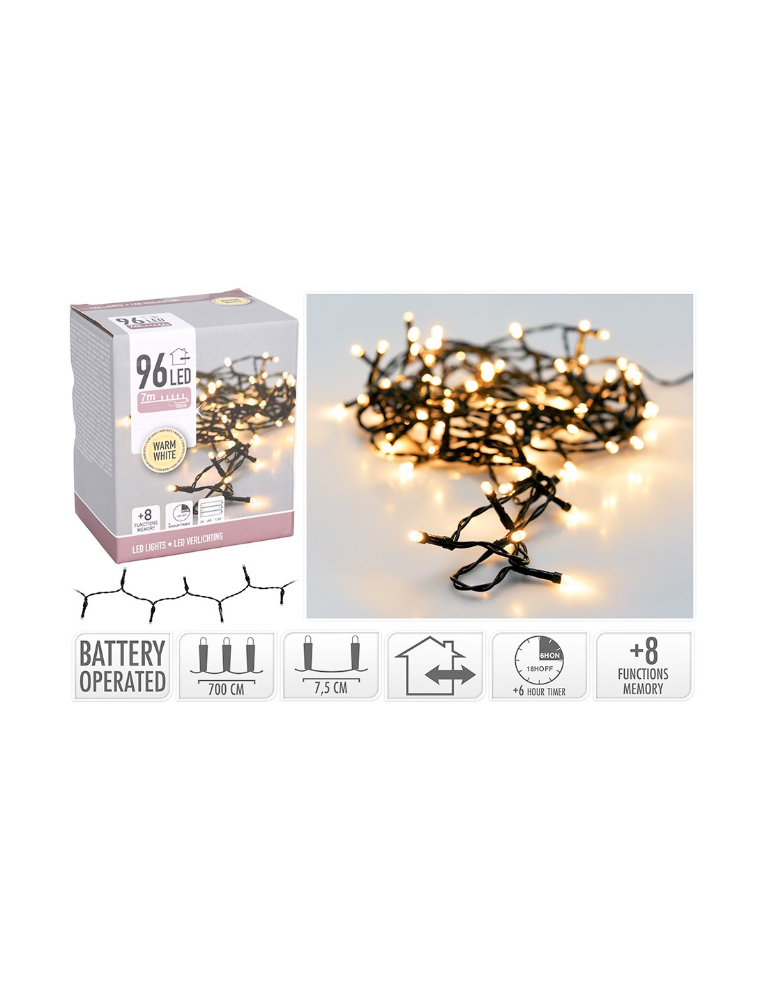 Guirnalda a pilas multifuncion 96 leds cable negro luz blanco calido pilas 3xaa no incluidas ip44 7,5cm entre bombillas leds 5mm programador 8 funciones con memoria + temporizador 6h encendido 18h apagado cable alimentación 50cm. distancia entre la primera bombilla y la ultima 7m. largo total: 7,50m.
