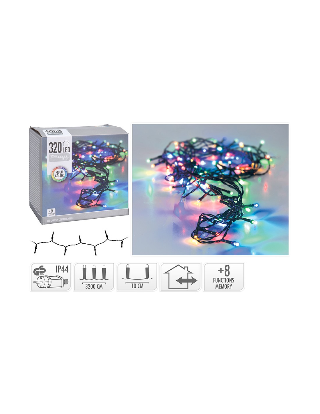 Guirnalda multifuncion 320 leds multicolor 220v 27m ip44 cable verde 3m. 10cm entre bombillas led 5mm programador 8 funciones con memoria adaptador ce