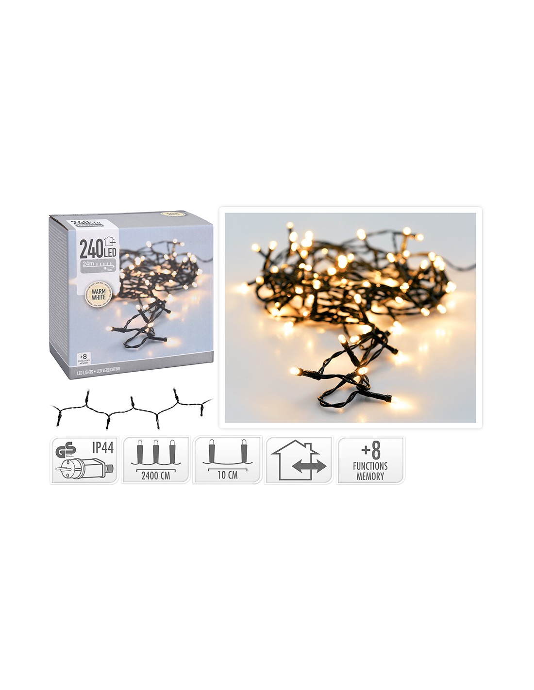 Guirnalda multifuncion 240 leds blanco calido 220v ip44 cable verde 7,5 cm entre bombillas led, programador, cable alimentación 3m. distancia entre la primera bombilla y la ultima 18m. largo total: 21m. 8 funciones con memoria adaptador ce
