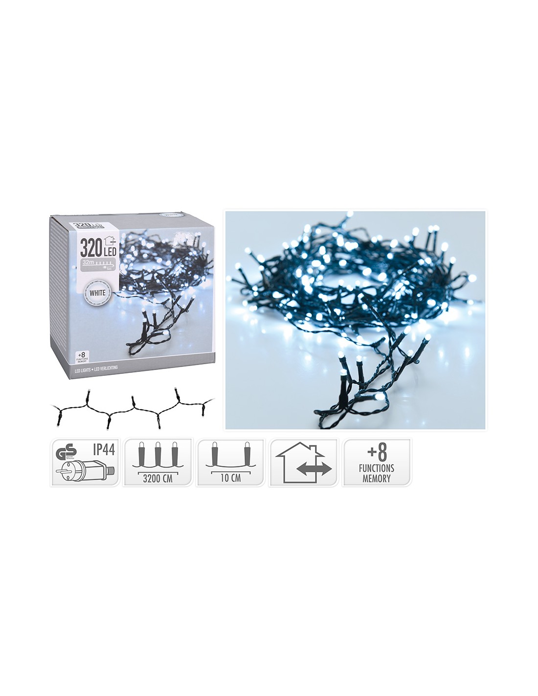 Guirnalda multifuncion 320 leds blanco frio 220v ip44 cable verde 10cm entre bombillas led 5mm programador 8 funciones con memoria adaptador ce cable alimentacion 3m. distancia entre la primera bombilla y la ultima 24m. largo total: 27m.