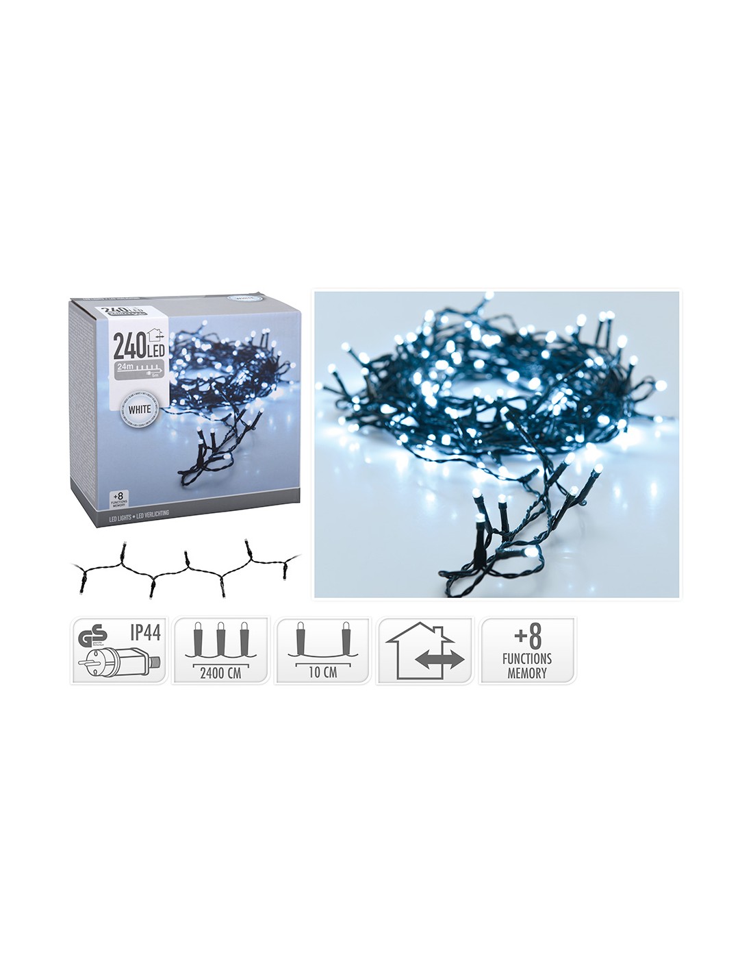 Guirnalda multifuncion 240 leds blanco frio 220v ip44 cable verde 7,5cm entre bombillas led 5mm programador 8 funciones con memoria adaptador ce cable alimentación 3m. distancia entre la primera bombilla y la ultima 18m. largo total: 21m.