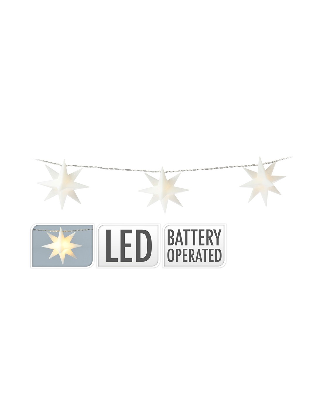 Guirnalda a pilas fija 10 leds estrellas decorativas ø8cm acabados surtidos transparente y escarchado luz blanco calido pilas 2xaa no incluidas ip20 cable transparente 15cm entre luces led cable alimentación 30cm. distancia entre la primera bombilla y la ultima 1,5m. largo total: 1,80m. colores / modelos surtidos