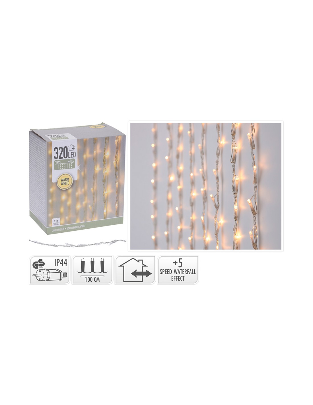 Cortina 320 leds blanco cálido con 5 funciones efecto cascada.medida: 1x2m.8 tiras, cada tira contiene 40 leds, distancia entre tiras: 14cm, bombilla de 5mm, incluye regulador de velocidades, cable transparente, cable de alimentación de 5m, adaptador ip44, clase energetica g.