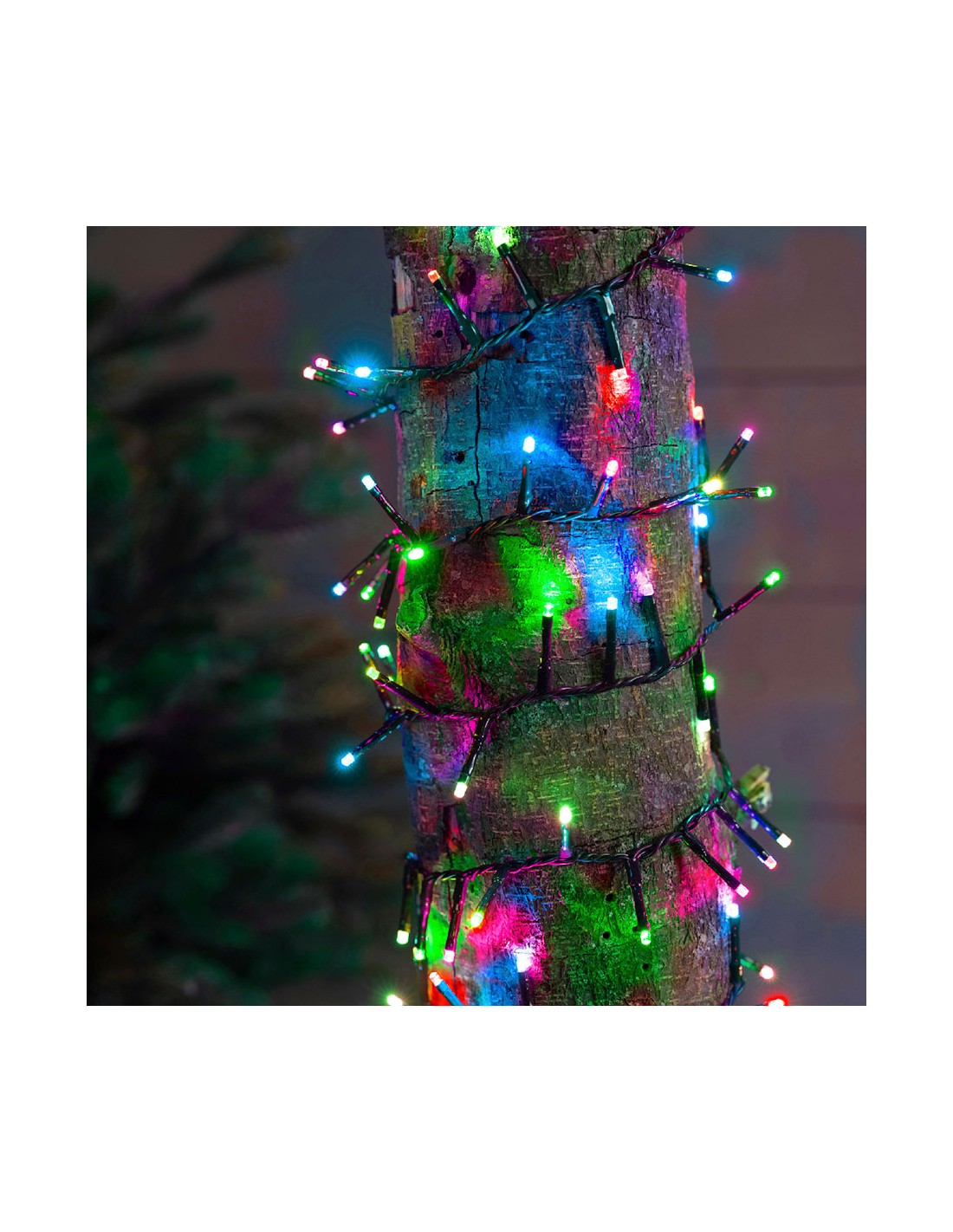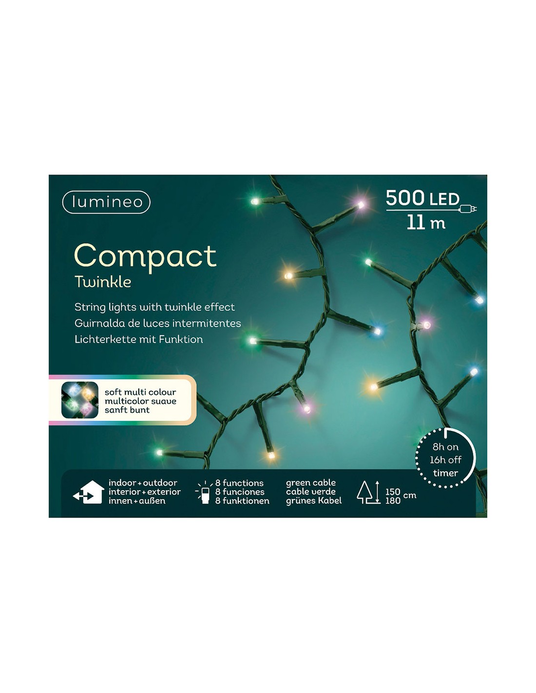 Guirnalda led compact parpadeante multicolor pastel 500 leds cable verde. exterior 8 funciones ip44 cable alimentacion 5m. distancia entre la primera bombilla y la ultima 11m. largo total: 16m.