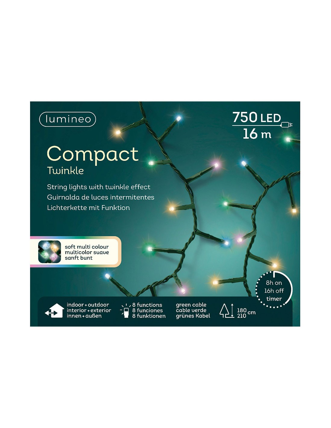 Guirnalda led compact parpadeante multicolor pastel, 750 leds. 8 funciones de efecto intermitente, incluyendo modo fijo, ip44, 220 - 240 v 50/60 hz, cable verde, cable de alimentación 5 m. distancia entre la primera bombilla y la última: 16 m. largo total: 21 m, para árbol de 180-210 cm. temporizador: 8 h encendido / 16 h apagado, incluye transformador