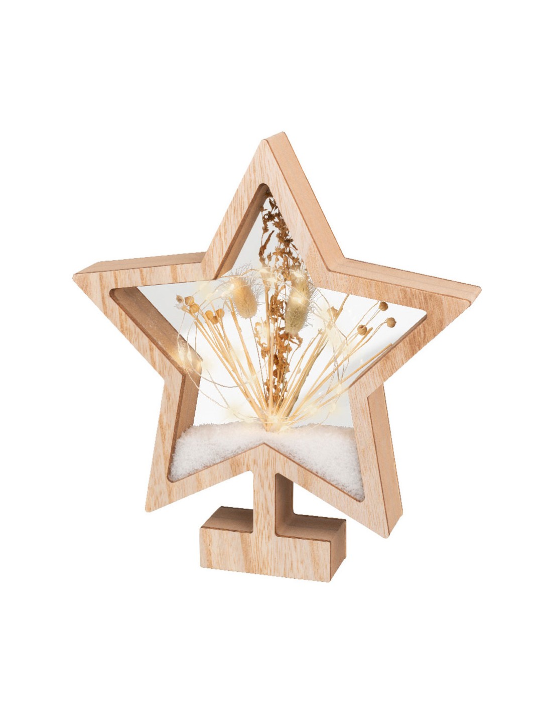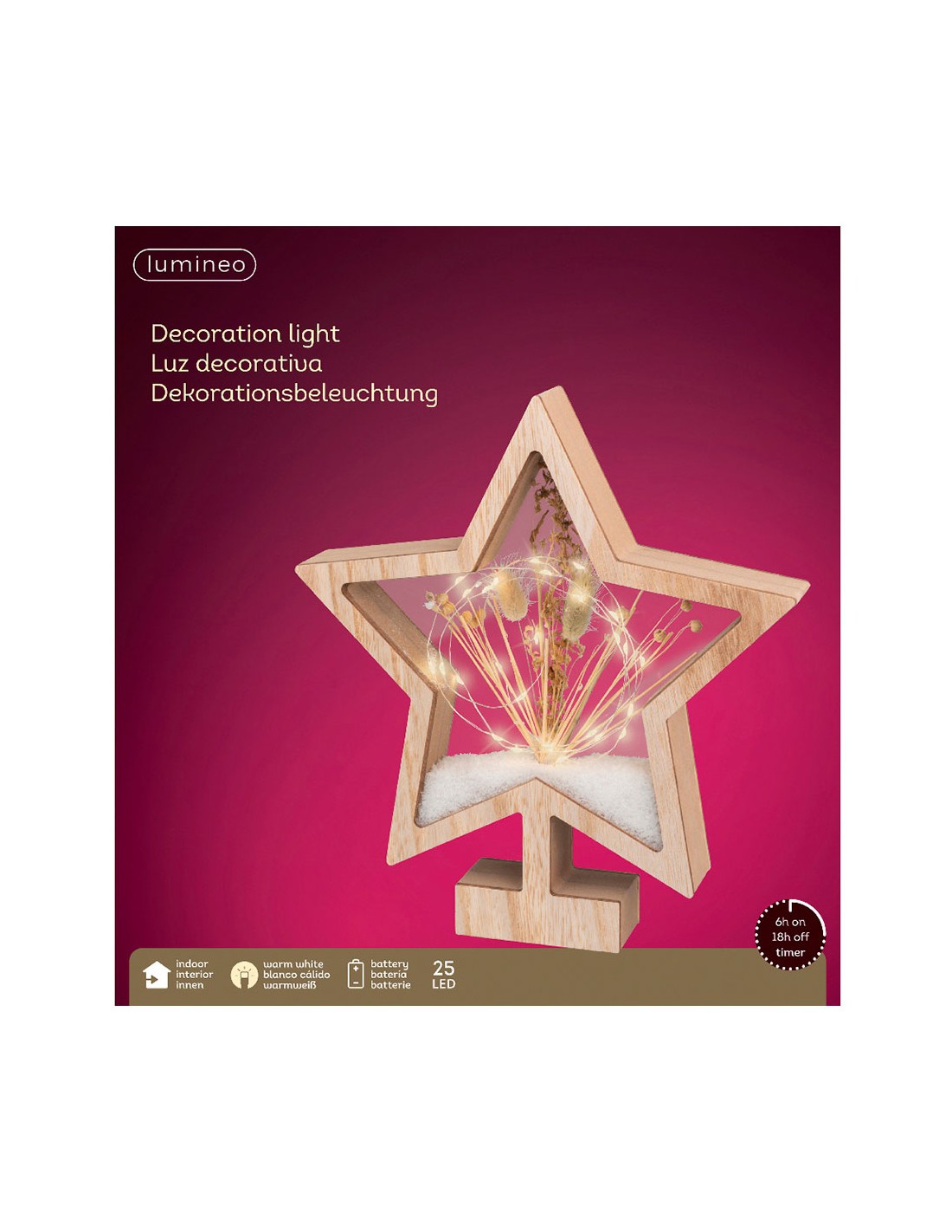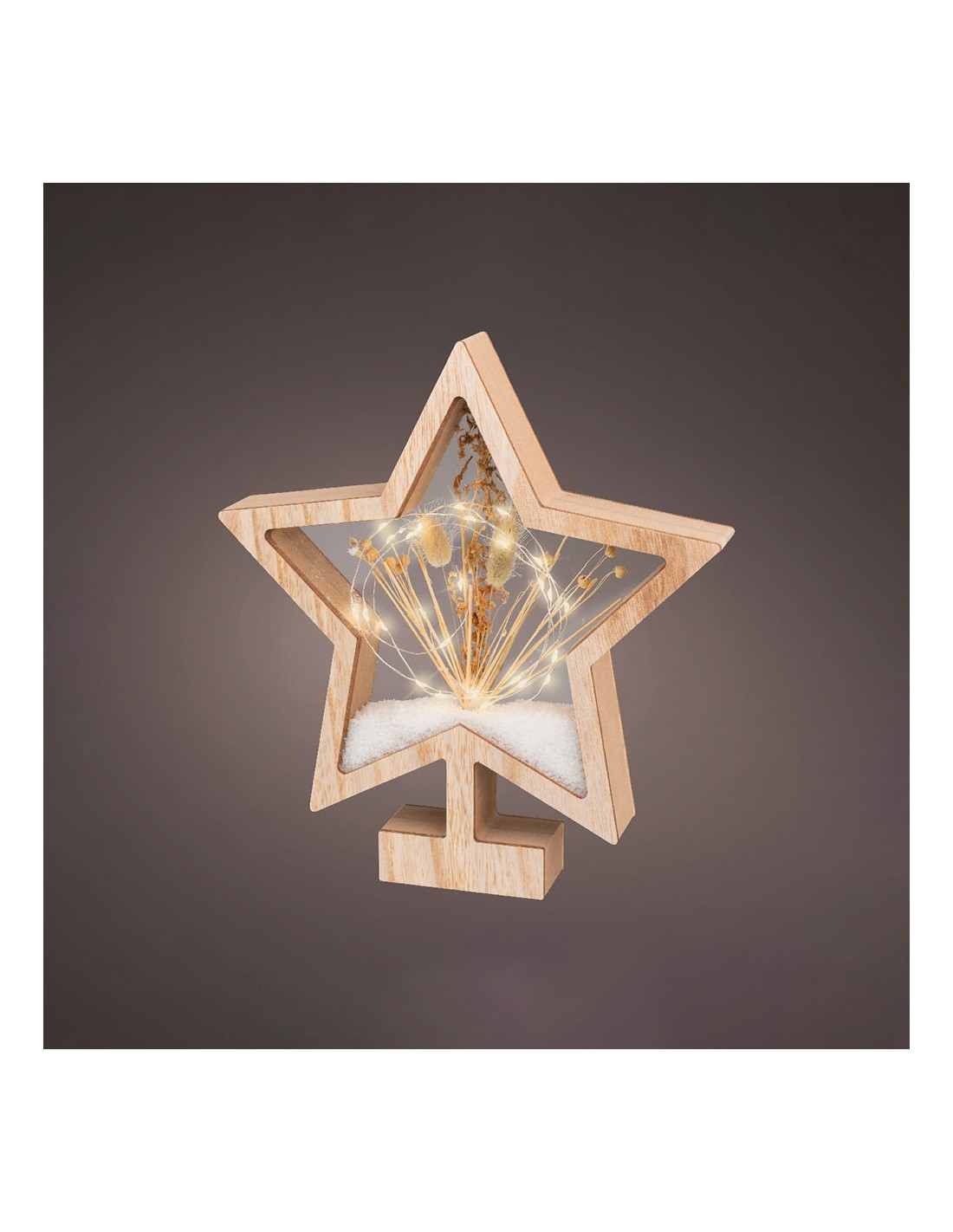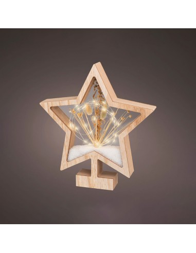 Estrella de madera con microleds 4x26x28cm 25 leds. interior ip20, blanco calido, detalles naturales, 2xaaa, con programador.