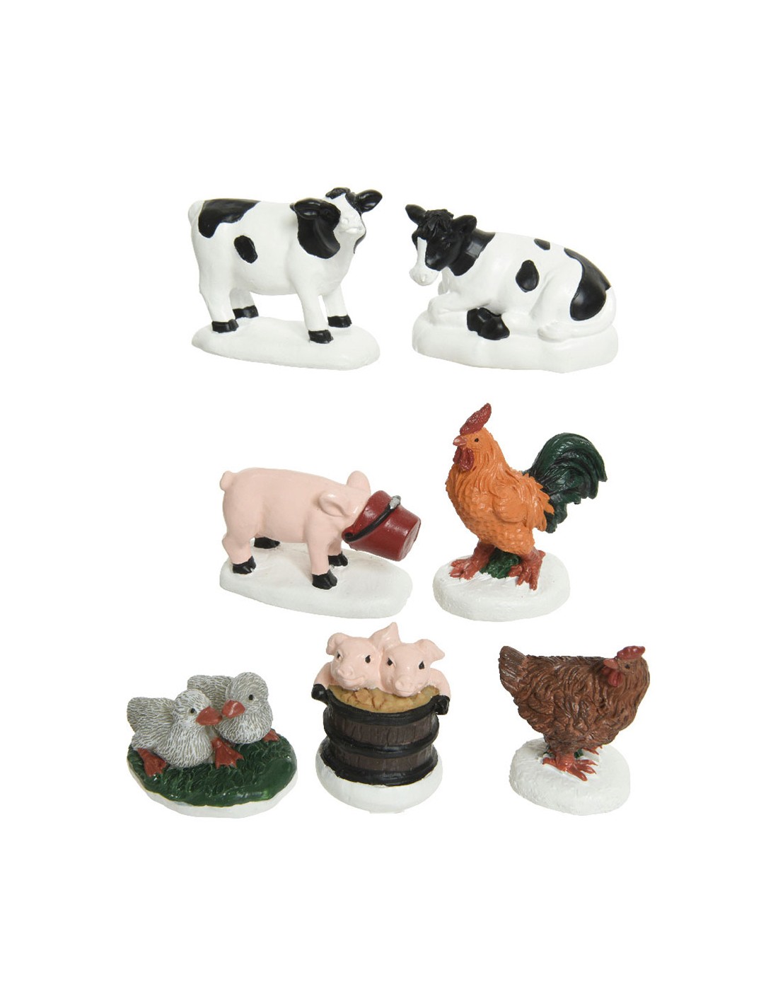 Blister de 7 figuras animales de granja de poliresina. lechón con cesta 2.5x4.5x2.8cm - lechones ø2.5x3.3cm - gallo 2.5x4x4.5cm - pollo 2x3x4cm - patos 2.5x3.5x2.8cm - vaca sentada 3x5x3.3cm - vaca de pie 2x5x4cm