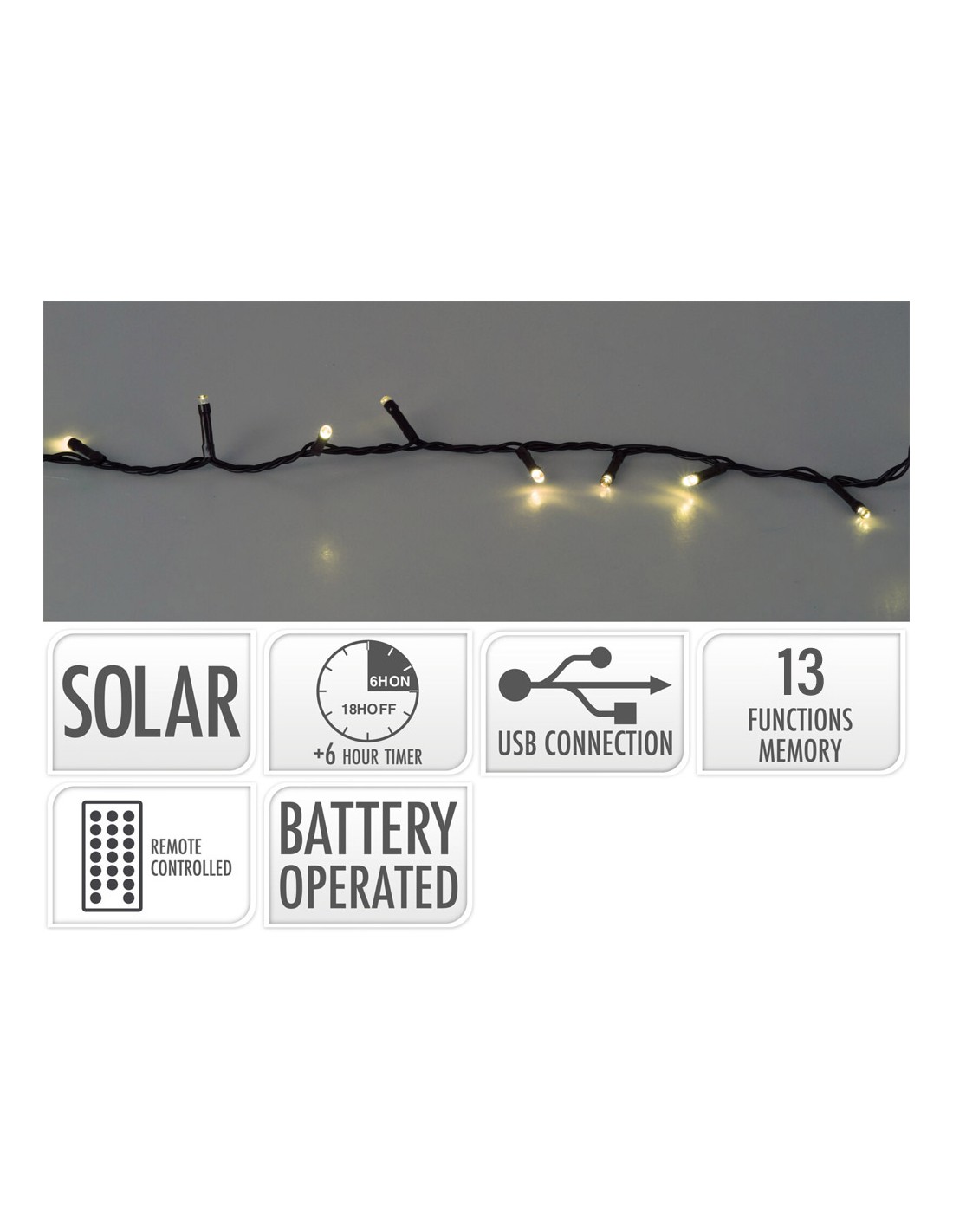 Guirnalda led solar, para exterior, parpadeante, 240 led, color blanco cálido. con 13 funciones. cable verde, cable alimentación negro usb, con mando a distancia (pila cr2025 incluida). distancia entre led 4,5 cm. distancia entre primer y último led 10m, cable de alimentación 3m, largo total de 13m. temporizador 6h.