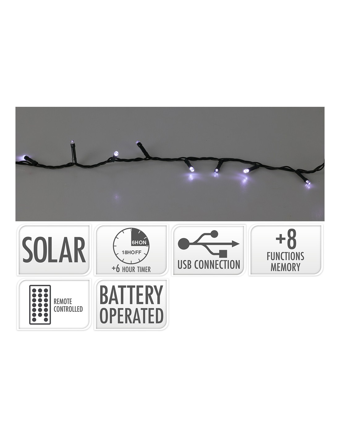 Guirnalda led, para exterior, parpadeante, 240 leds, blanco frio. solar, 13 funciones. cable alimentacion negro, usb y con mando a distancia. distancia entre primer y ultimo led 1075.5cm, distancia entre leds 4.5cm, leds de 5 mm, cable de alimentación 3 m, largo total 1375.5cm. temporizador 6h. vida estimada 40h. mando 1 x cr2025 3v litio