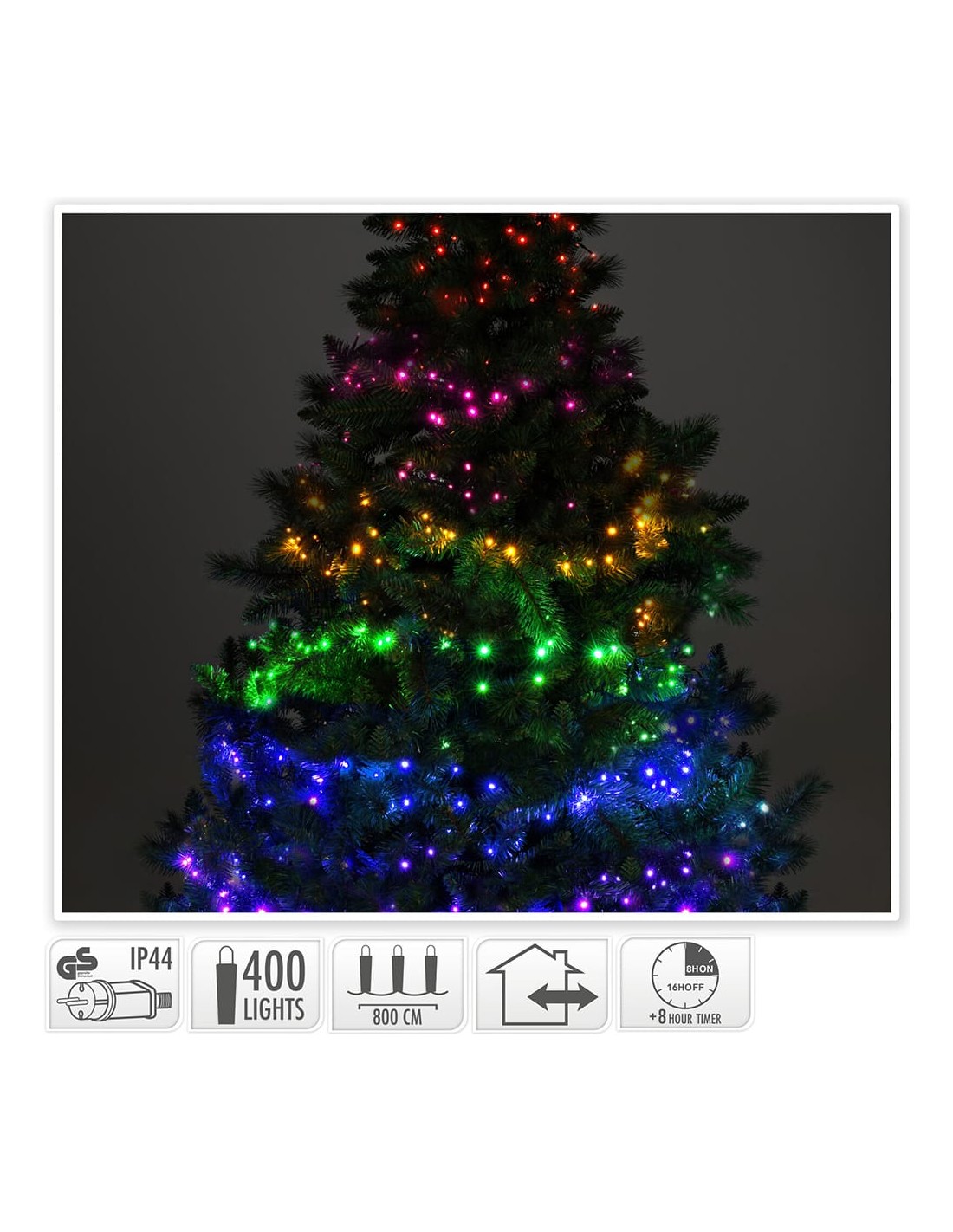 Guirnalda led, 7 secciones de color, para interior y exterior, 400 leds, 220v, distancia entre primer y ultimo led 8m, temporizador 8h. cable 350cm