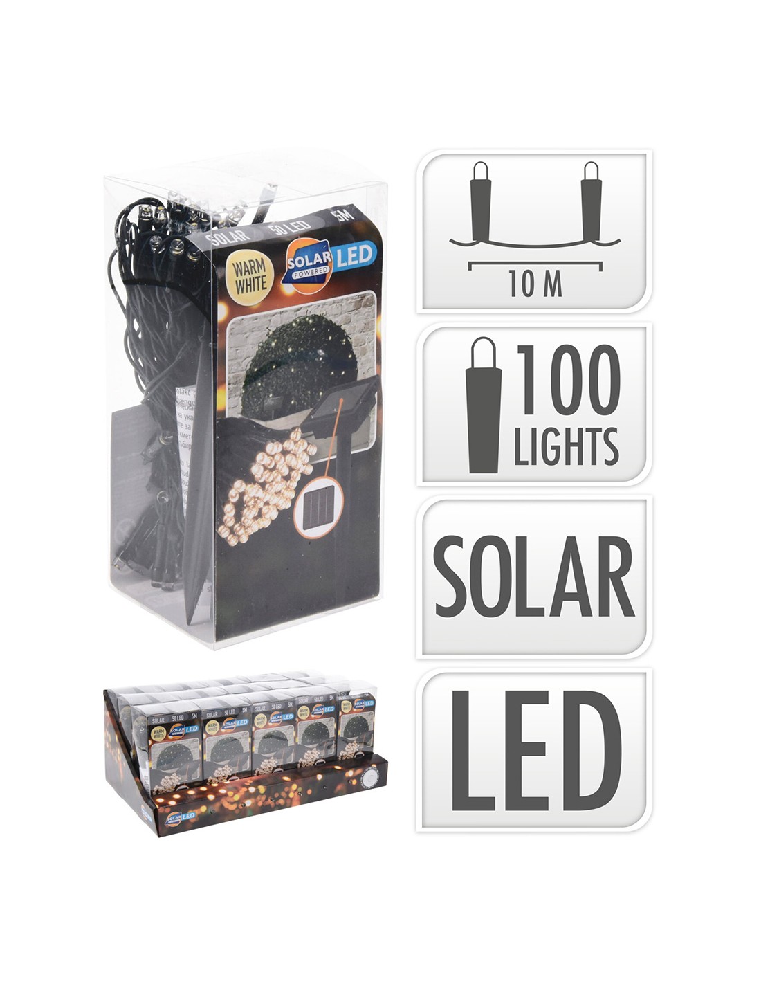 Guirnalda led, blanco calido, para exterior, ip44, 100 leds, solar, cable alimentacion negro de 2m, distancia entre el primer y ultimo led 10m