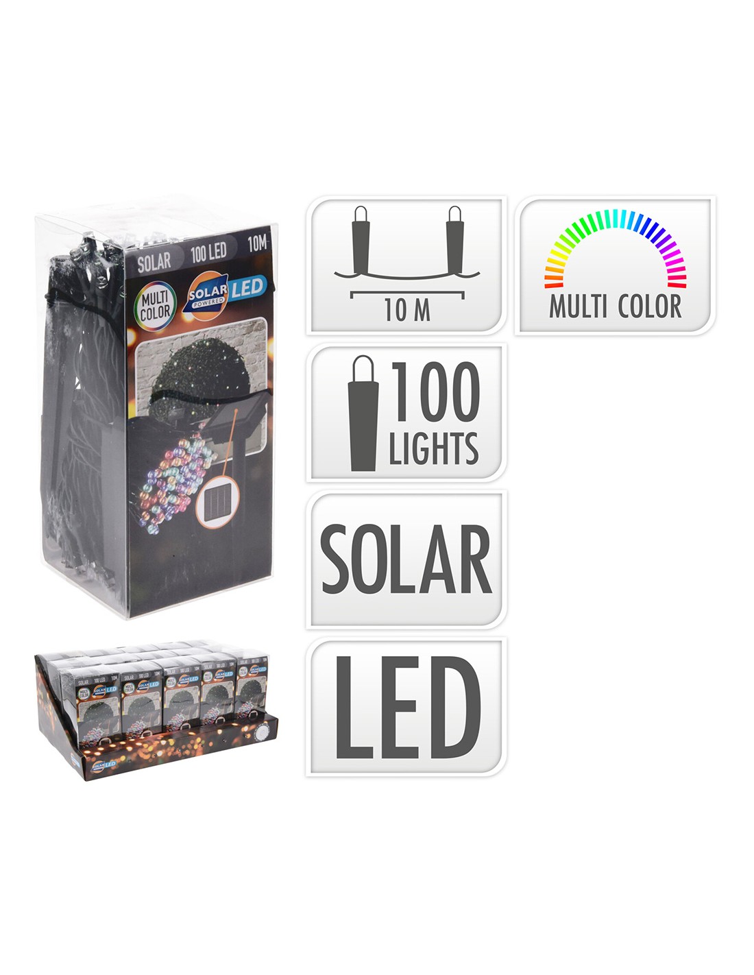 Guirnalda led solar, multicolor, para exterior ip44, 100 leds, cable alimentacion negro de 2m, distancia entre el primer y ultimo led 990cm.distancia entre leds de 10cm. longitud total 12m.baterias recargables incluidas.