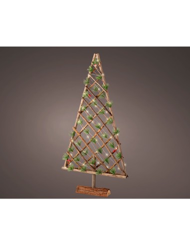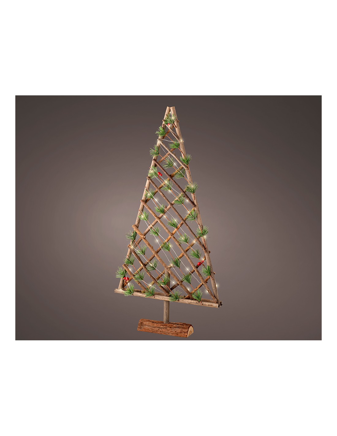 Árbol decorativo de madera, con 40 microled, con luz fija blanca cálida, funciona con pilas 3 x aa no incluidas, tiene un saco de yute para ocultar el portapilas. para uso interior. el cable de alimentación es de 30cm transparente. temporizador 6 h. medida 40 x 7 x 80 cm