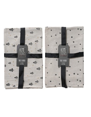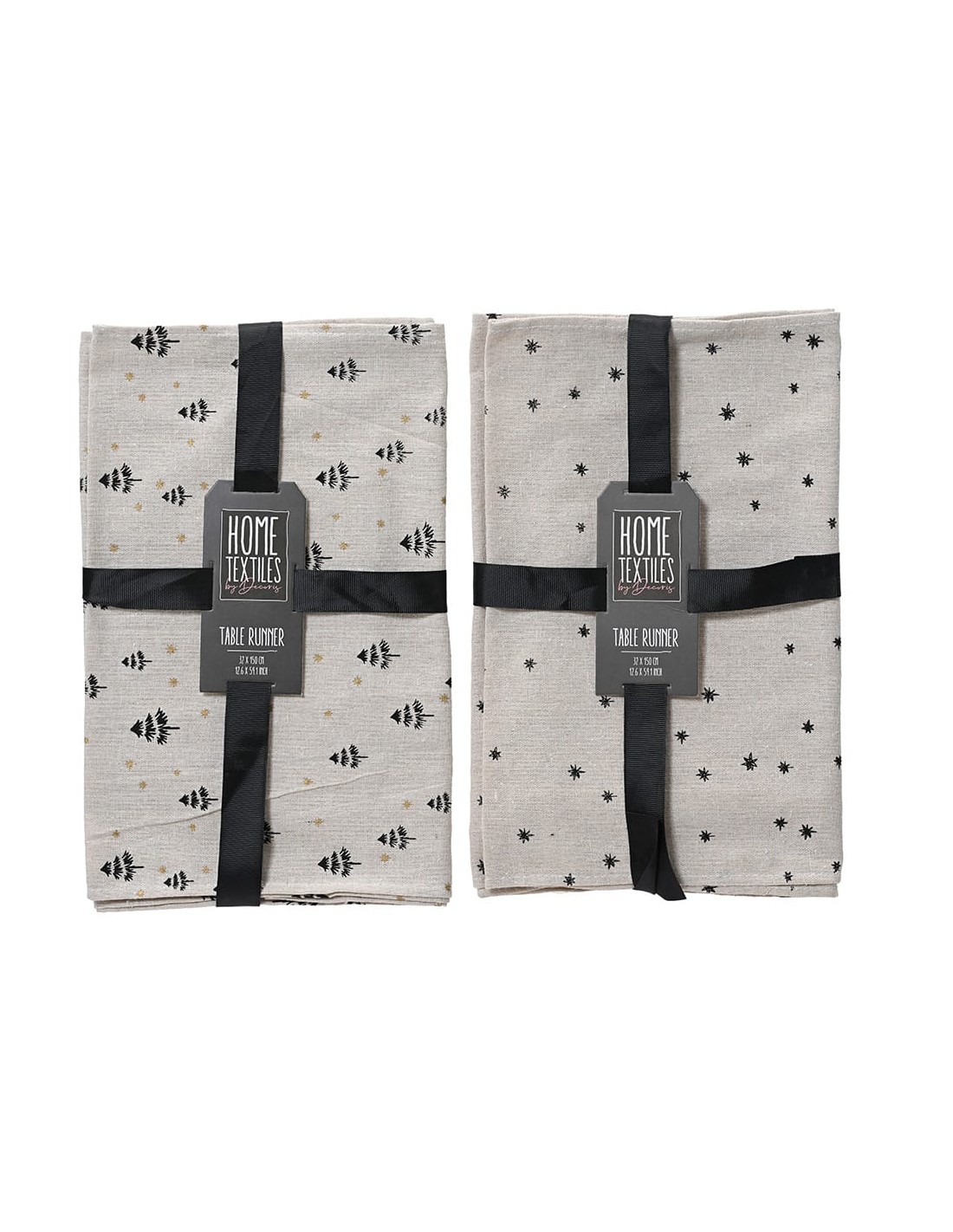 Camino de mesa con estampados en negro, 2 modelos: 1 x pinos y estrellas doradas, 1 x estrellas negras, 32x150cm