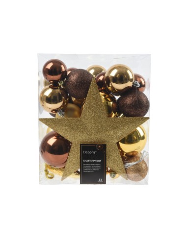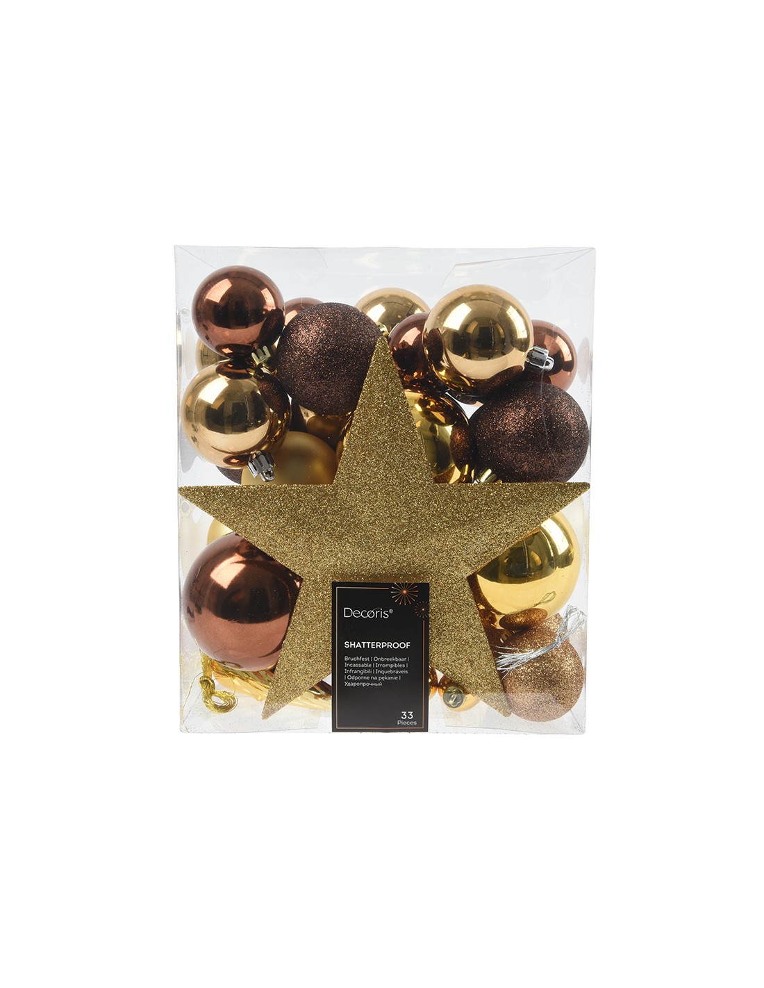Juego de 33 adornos 1x estrella top arbol brillantina dorada bola brillante dorada 2xø8cm bola brillante marrón 2xø8cm, bola brillante marrón 6xø6cm bola mate dorada 6xø6cm bola brillantina marrón 6xø6cm bola brillante marrón 4xø5cm bola marrón claro brillantina 3x5cm 3 carambanos dorados brillantes.