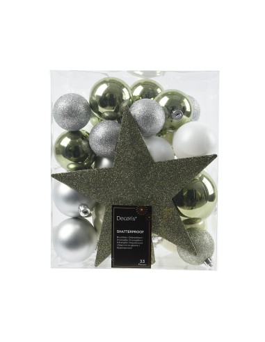 Juego de 33 adornos 1x estrella top arbol brillantina dorada bolas brillantes doradas 2x8cm bolas blancas 2x8cm, 6x6cmbolas plata mate 6x6cm bolas esmalte doradas 6x6cm bolas plata brillantina 4x 5cm carambano brillantina blanco 3x5cm.
