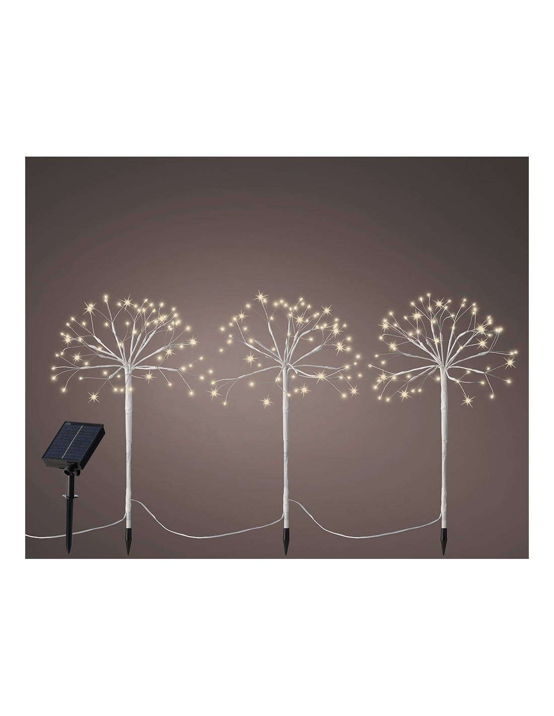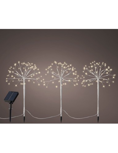 Conjunto de 3 estacas mini arboles solar, parpadeante, 3x60leds, blanco cálido, 8 funciones, largo de los 3 árboles 2m, distancia entre árboles 1m, altura de los árboles 45cm, longitud de cada rama 12,5cm, cable alimentación 3m color blanco, bateria 1ximr18650 li-ion 1.500mah (inluida), puede ser cargado en interior por usb, para exterior ip44, panel solar policristalino,4 dís de luz cuando está completamente cargado, tiempo funcionamiento 6h aprox. con interruptor de encendido/apagado
