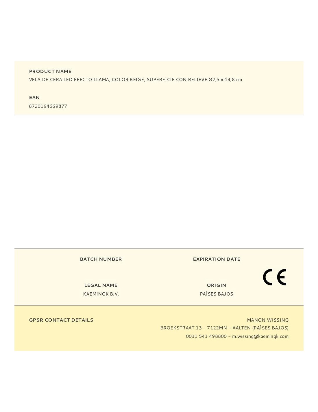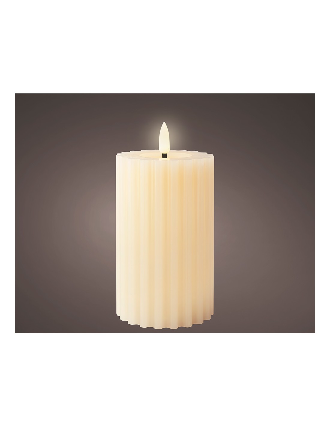 Vela de cera led efecto llama, color beige, superficie con relieve, medidas: ø7,5 x 14,8 cm. uso: interior. color led: luz cálida. con temporizador 6 h, autonomía: 250 h, funciona con pilas 2 x aaa (no incluidas)
