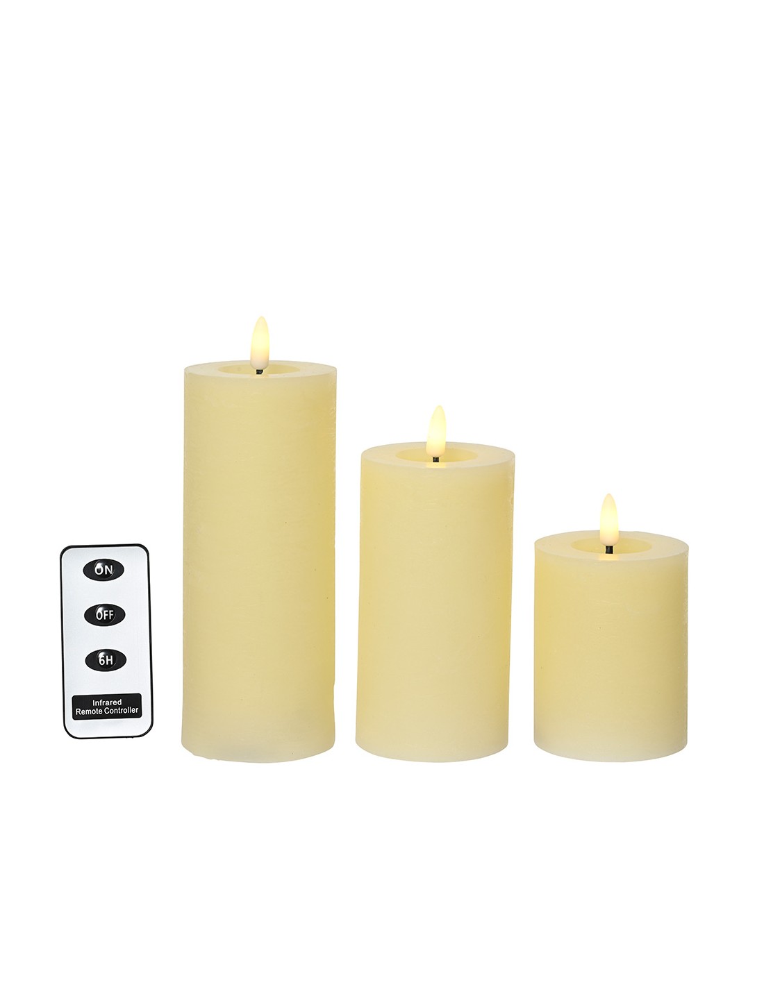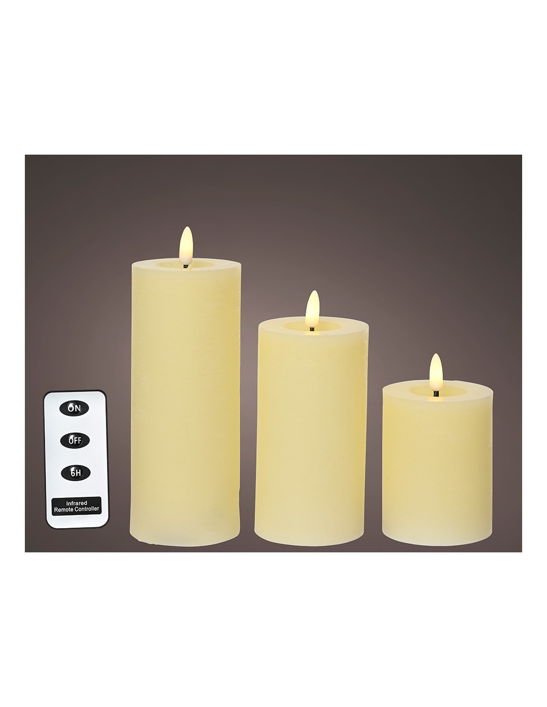Vela de cera led color beige ø7 cm con diferentes alturas, 3 uds, superficie lisa, acabado rústico, medidas: ø7,00 x 11,2 cm ø7,00 x 15 cm ø7,00 x 19 cm. función: efecto llama uso: interior color led: luz cálida funciona con pilas 2 x aaa funcionamiento con mando a distancia
