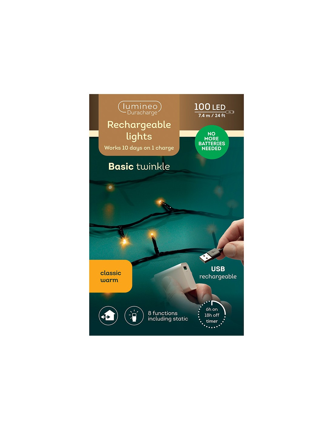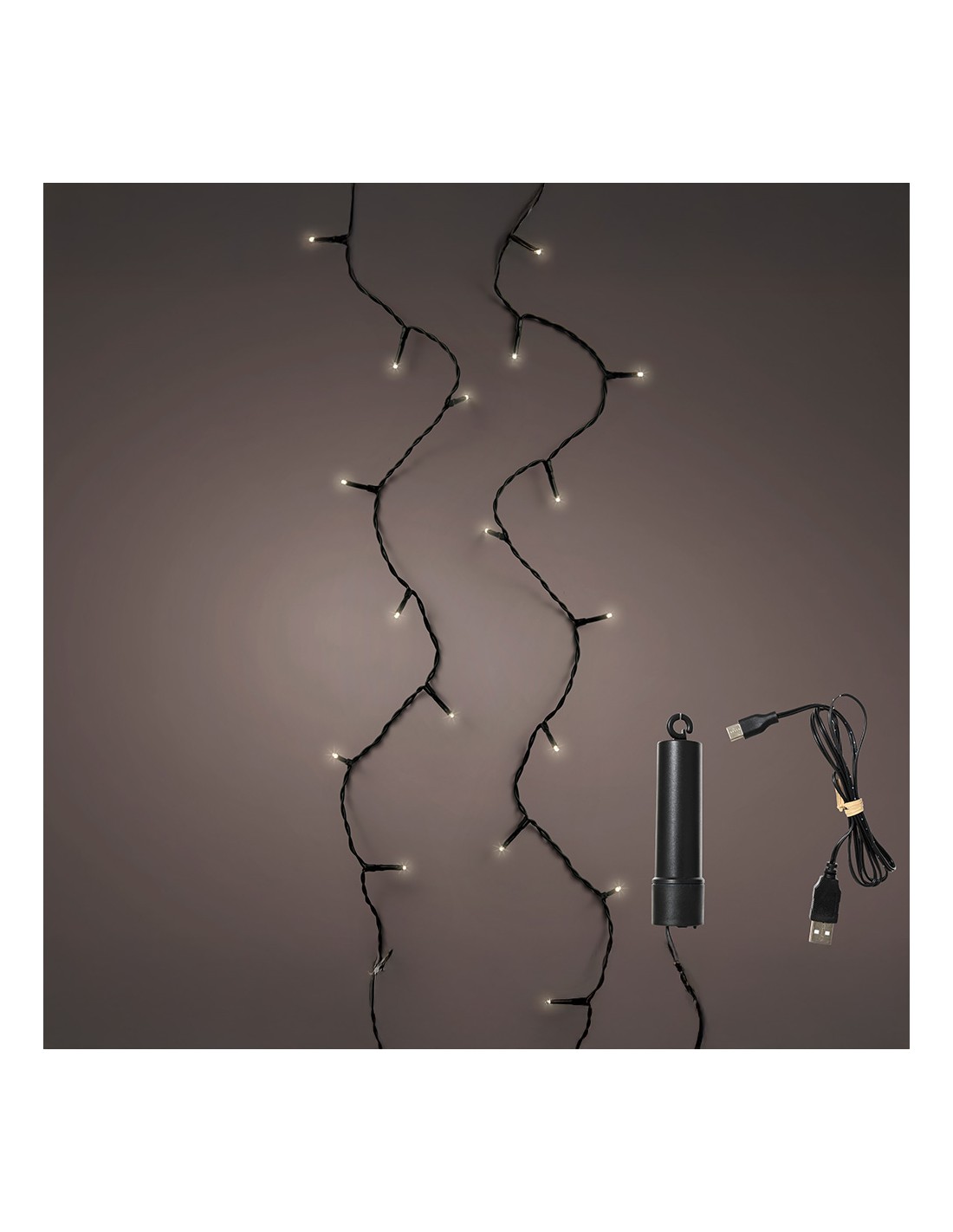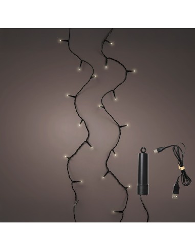 Guirnalda led multifunción con batería, 100 leds, luz cálida, exterior, con 8 funciones de efecto intermitente, incluyendo modo fijo, distancia entre bombillas 7,5 cm, distancia entre la primera bombilla y la última 7,4 m, cable alimentación 30 cm, largo total: 7,7 m, duración estimada de batería 10 días, cable usb tipo c incluido, bateria 3,7 v 1500 mah