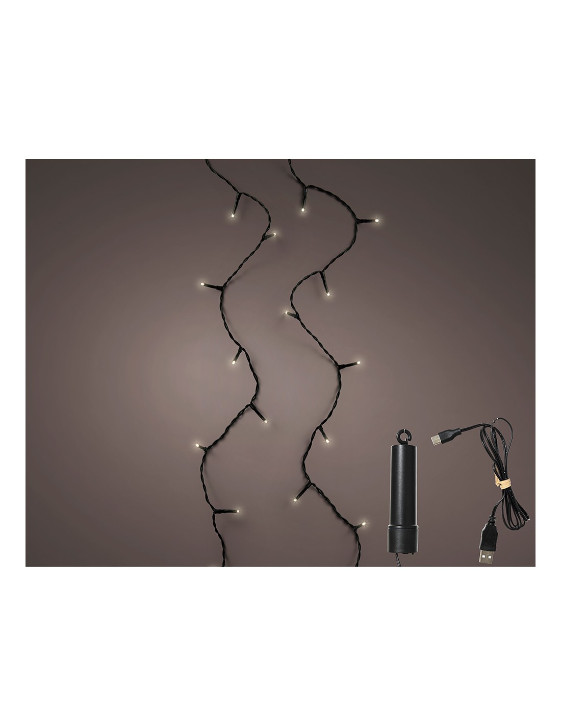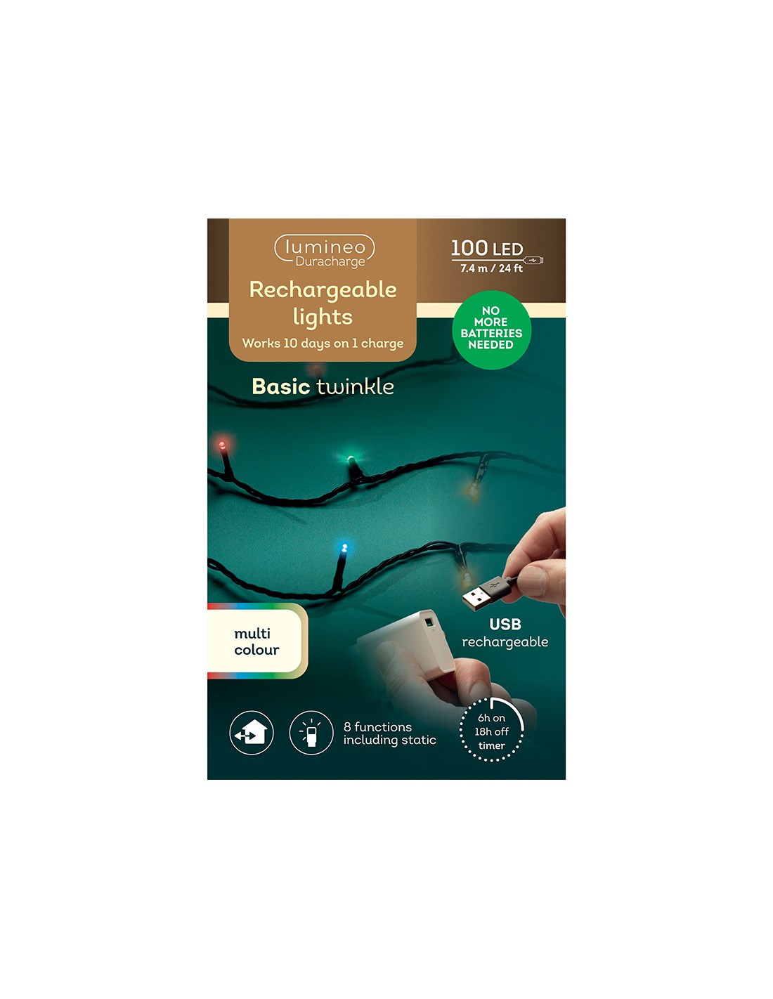 Guirnalda led multifunción 100 leds multicolor 220 - 240 v 50/60 hz, ip44, cable negro, 8 funciones, con batería 3,7 v 1500 mah, cable alimentación 30 cm, distancia entre leds 7,5 cm, distancia entre la primera bombilla y la última 7,4 m, largo total 7,70 m. temporizador: 8 h encendido / 16 h apagado. duración estimada de batería: 10 días se recarga en 5 h cable usb incluido