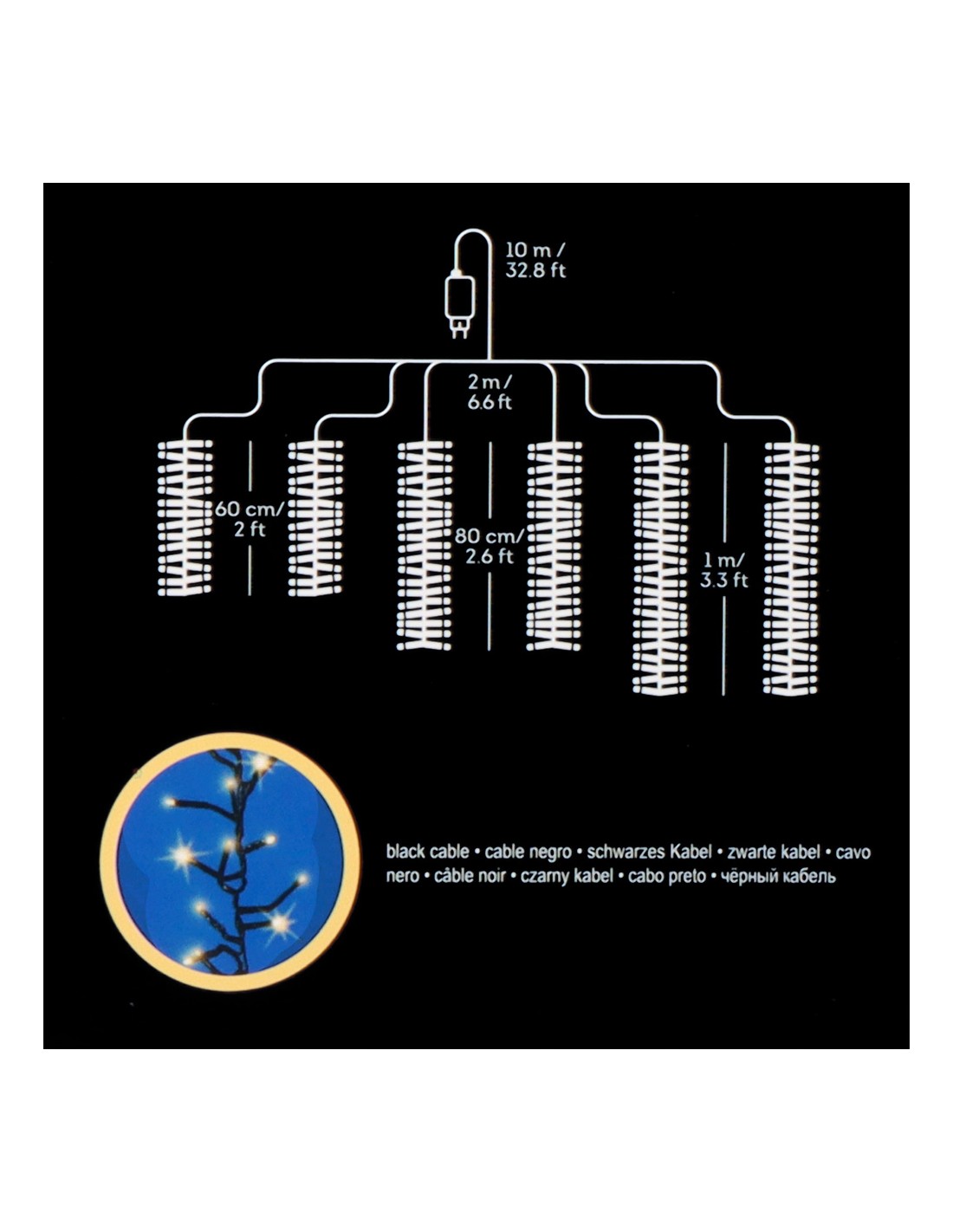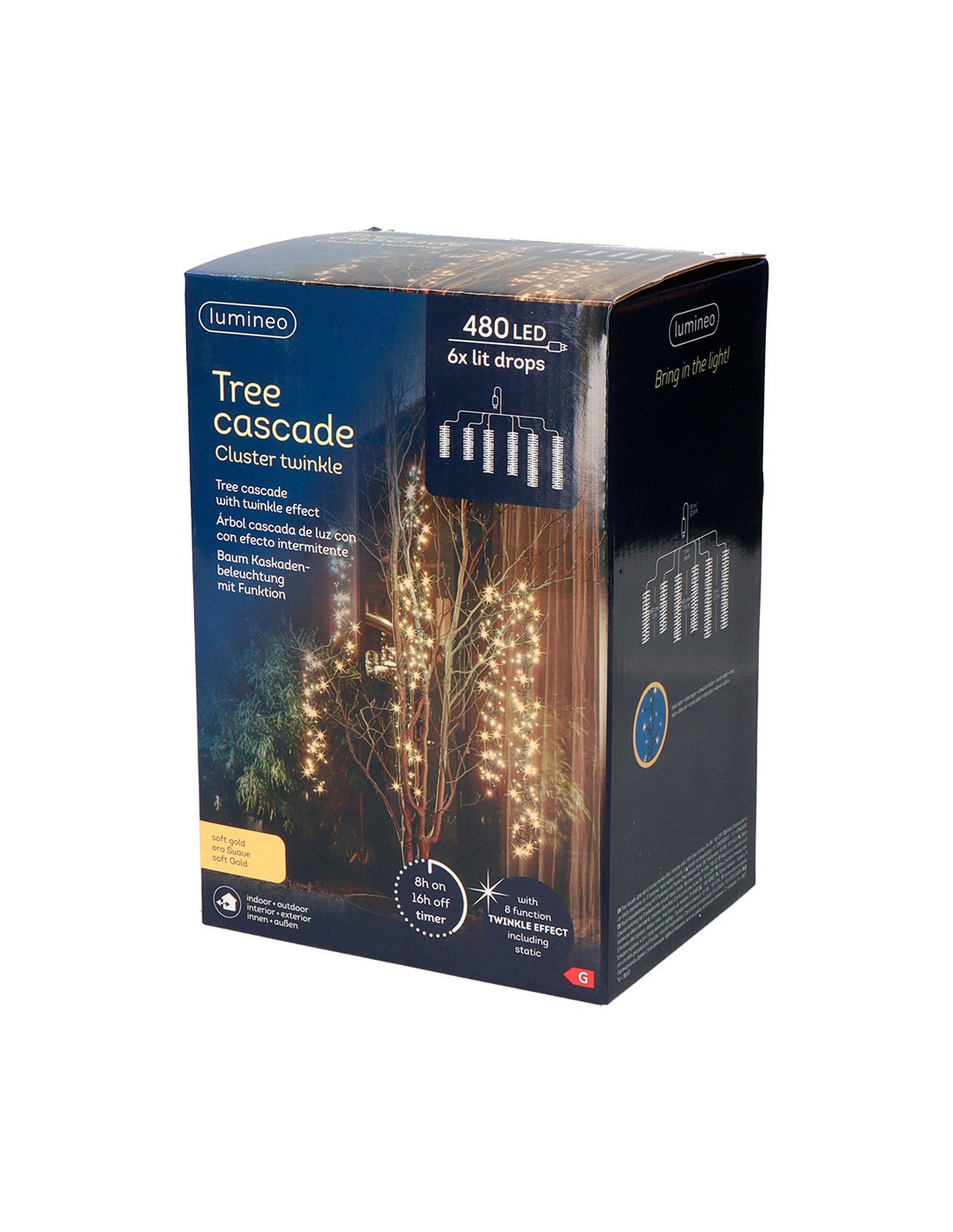 Cortina cascada para árbol 480 leds, oro suave, 220 - 240 v 50/60 hz, exterior ip44, cable negro, 8 funciones de efecto intermitente incluyendo modo fijo. cable alimentación 10 m, largo cortna 2 m, con tiras colgantes de diferentes longitudes (60 / 80 / 100 cm), largo total 12 m, temporizador: 8 h encendido / 16 h apagado