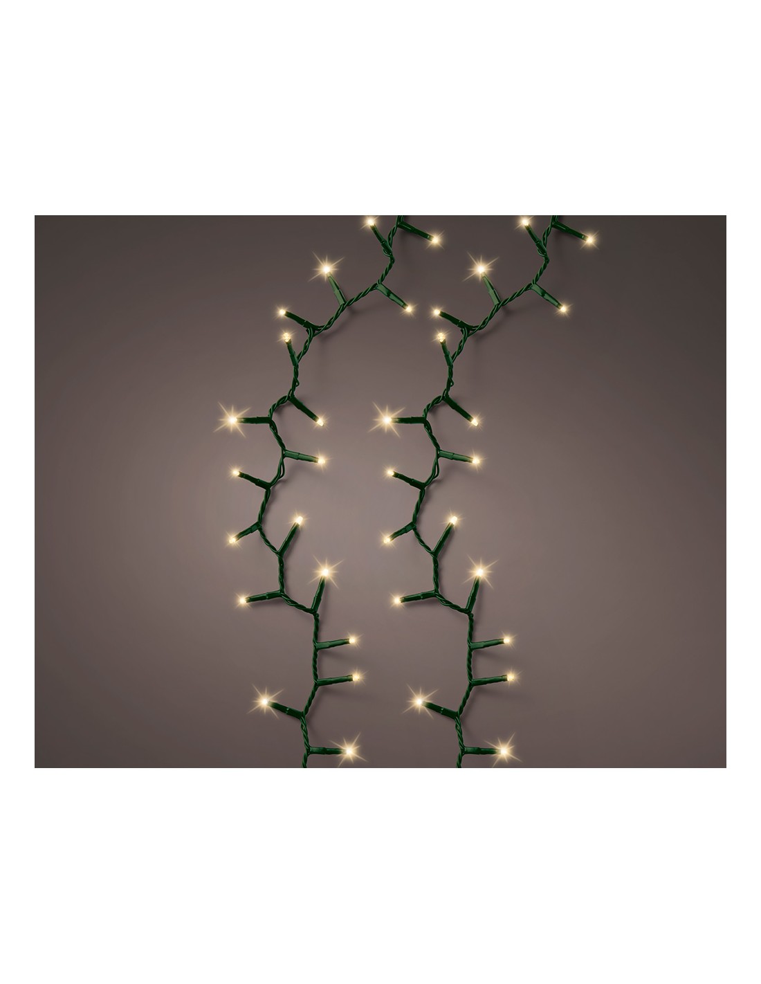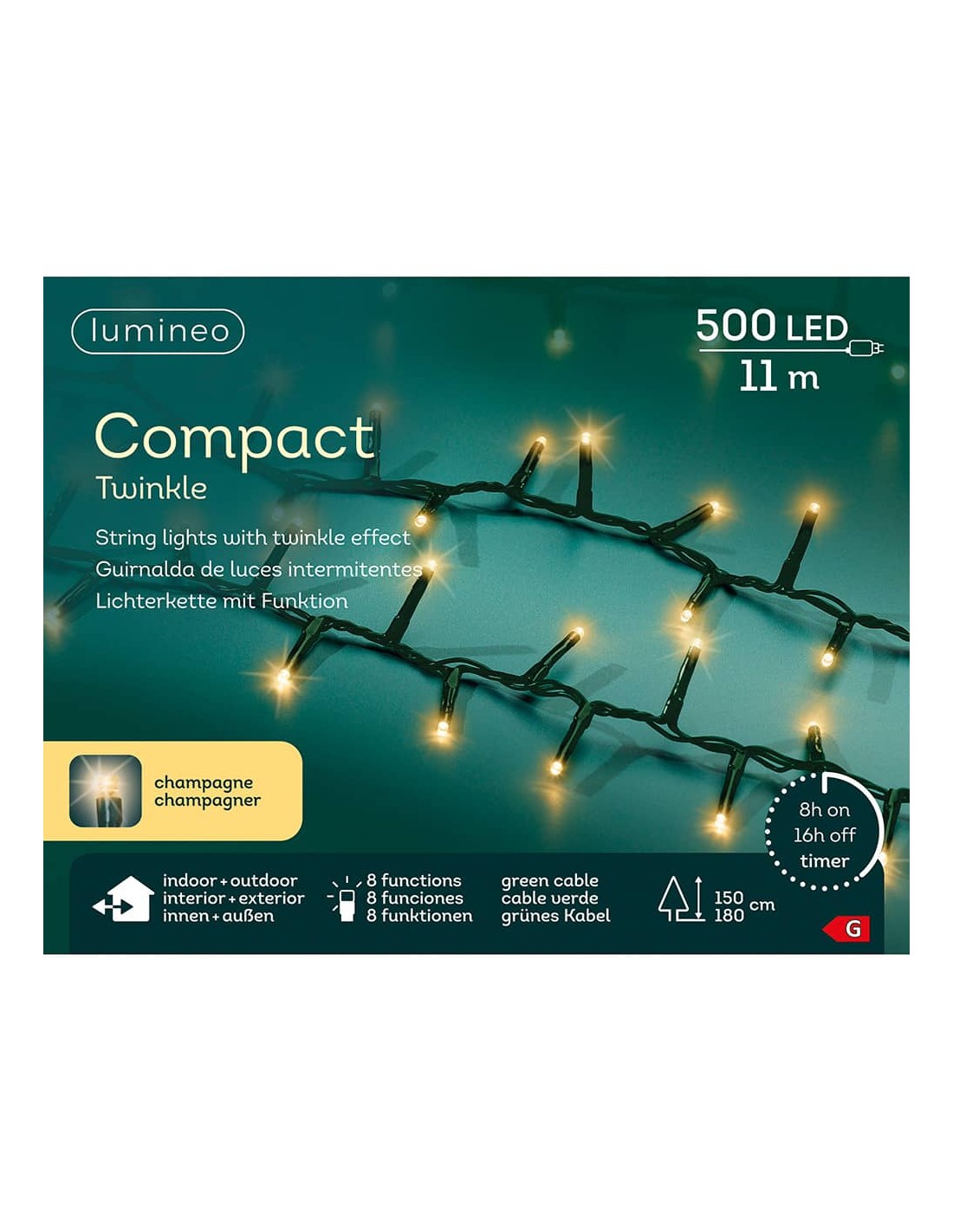 Guirnalda led compact multifunción 500 leds oro suave 220 - 240 v 50/60 hz, ip44, cable verde, programador de 8 funciones con memoria, adaptador ce, cable alimentación 5 m, distancia entre la primera bombilla y la última 11 m, largo total 16 m, para árbol 150 - 180 cm, temporizador 8 h encendido / 16 h apagado