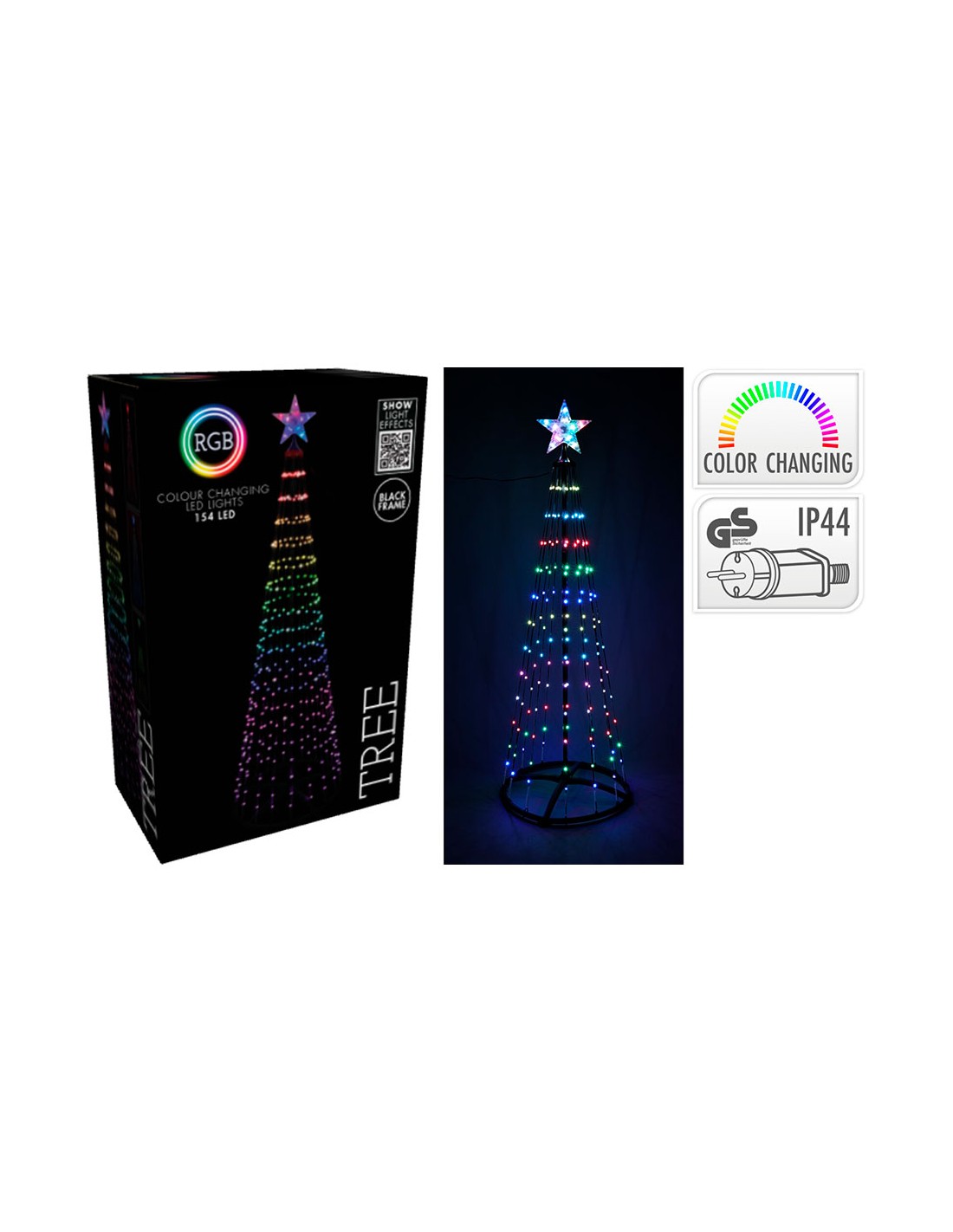 Árbol de navidad con estructura de color negro, 154 led rgb digitales, estrella con 10 leds, consta de 12 cuerdas, cada una de 12 leds, cable 500 cm, multifunción, 4 pines para anclarlo al suelo, para exterior ip44, mando a distancia (incluido), dimensiones base ø50 cm, altura total 1,5 m, 220-240 v~50/60 hz