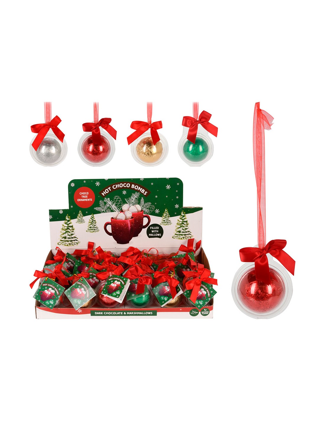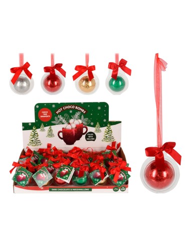 Bola de plástico con cinta, contiene chocolate negro relleno de mini malvaviscos y envoltorio de colores surtidos. presentado en expositor de 24 uds