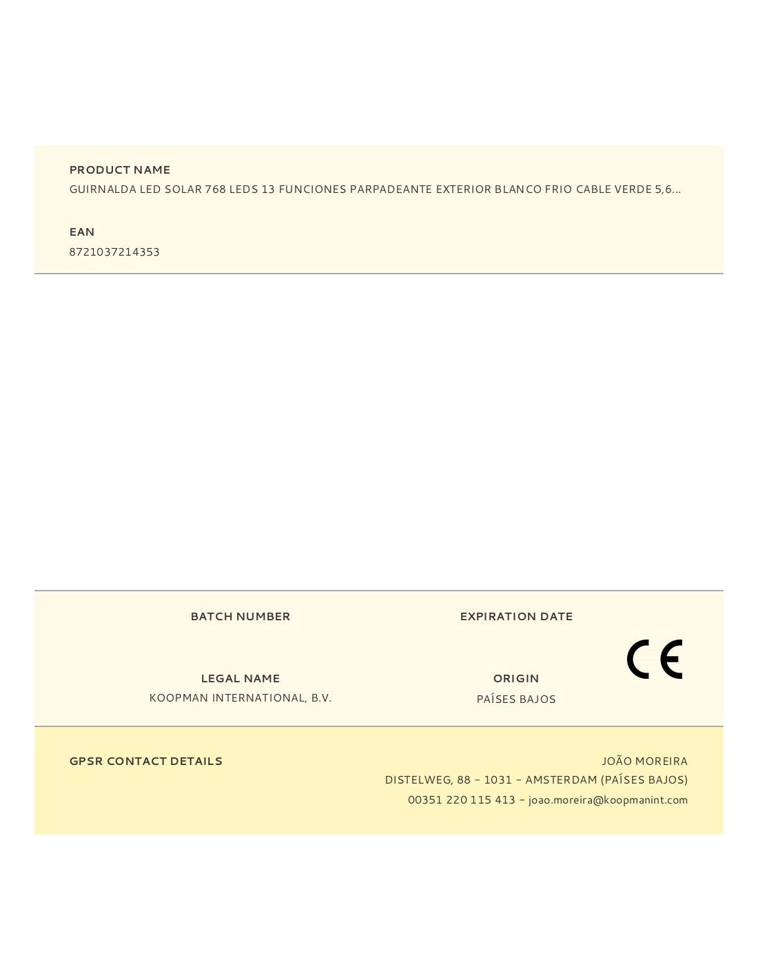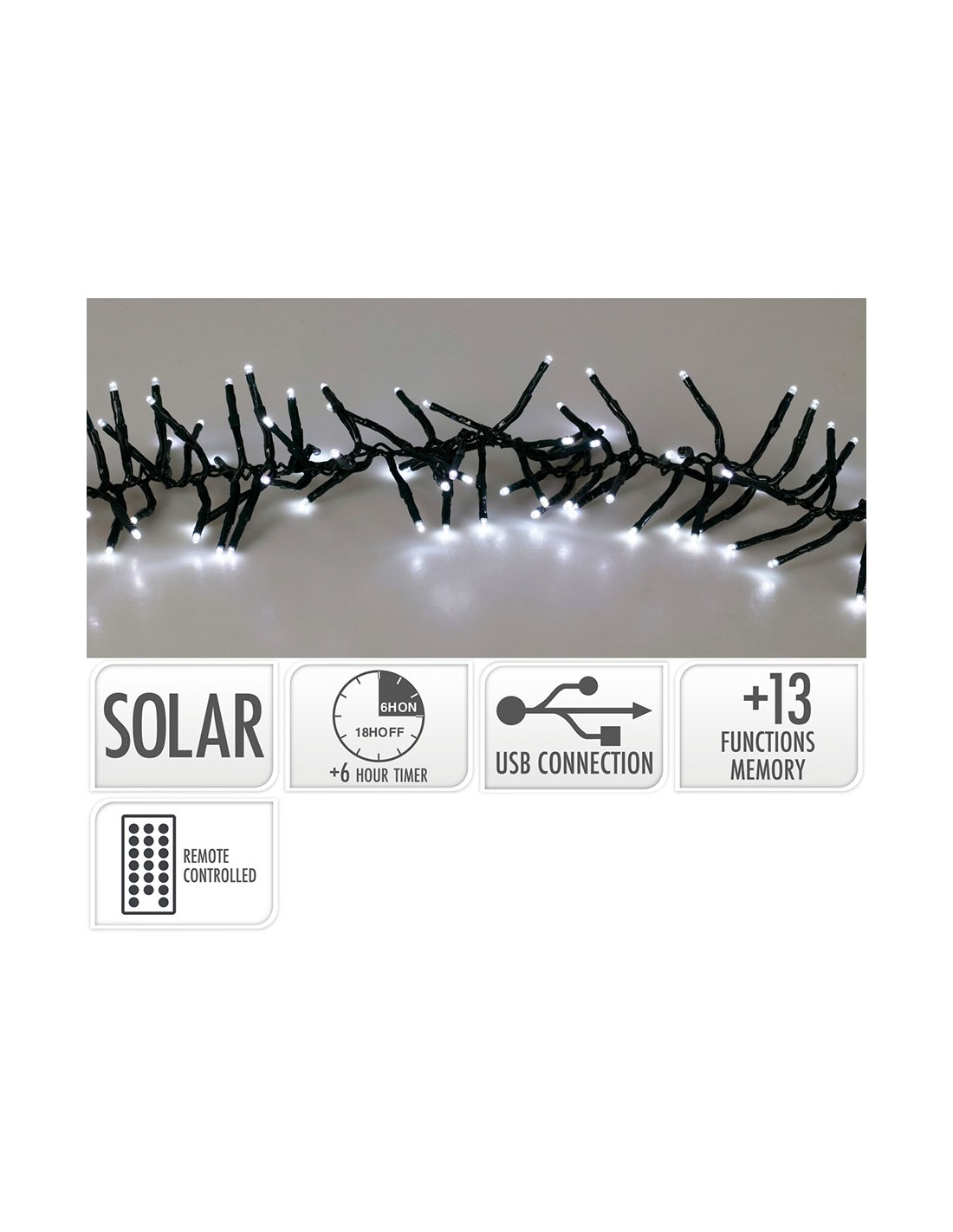 Guirnalda solar recargable, 768 leds, luz fría, 220 - 240 v~50/60 hz, para exterior ip44, cable verde, panel solar 24 v, 13 funciones de efecto intermitente, incluyendo modo fijo y chip de memoria, función de temporizador, se puede cargar por cable usb (incluido). batería recargable no reemplazable li-ion 3,7 v, cable 3 m, distancia entre la primera bombilla y la última 5,6 m, distancia entre leds 7,3 cm, longitud total 8,6 m. mando a distancia con pila cr2025 (incluida)