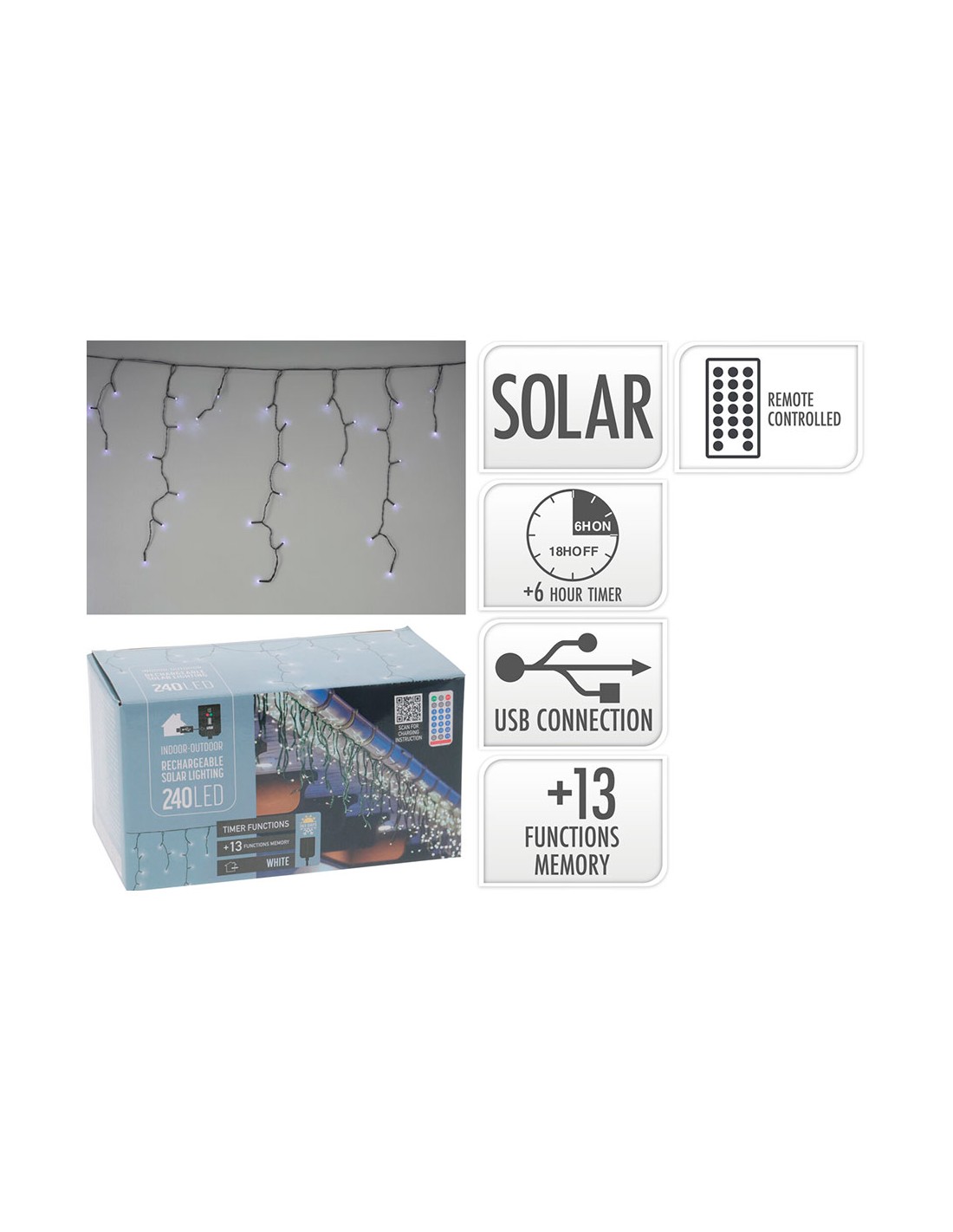 Cortina solar recargable, 240 leds, luz fría, 220 - 240 v~50/60 hz, para exterior ip44, cable verde, panel solar 24 v, 13 funciones de efecto intermitente, incluyendo modo fijo y chip de memoria, función de temporizador, se puede cargar por cable usb (incluido). batería recargable no reemplazable li-ion 3,7 v, cable 3 m, distancia entre la primera bombilla y la última 7,8 m, distancia entre tiras 15 cm, longitud total 10,8 m. mando a distancia con pila cr2025 (incluida), carga 6 h aprox., tiempo de iluminación 40 h