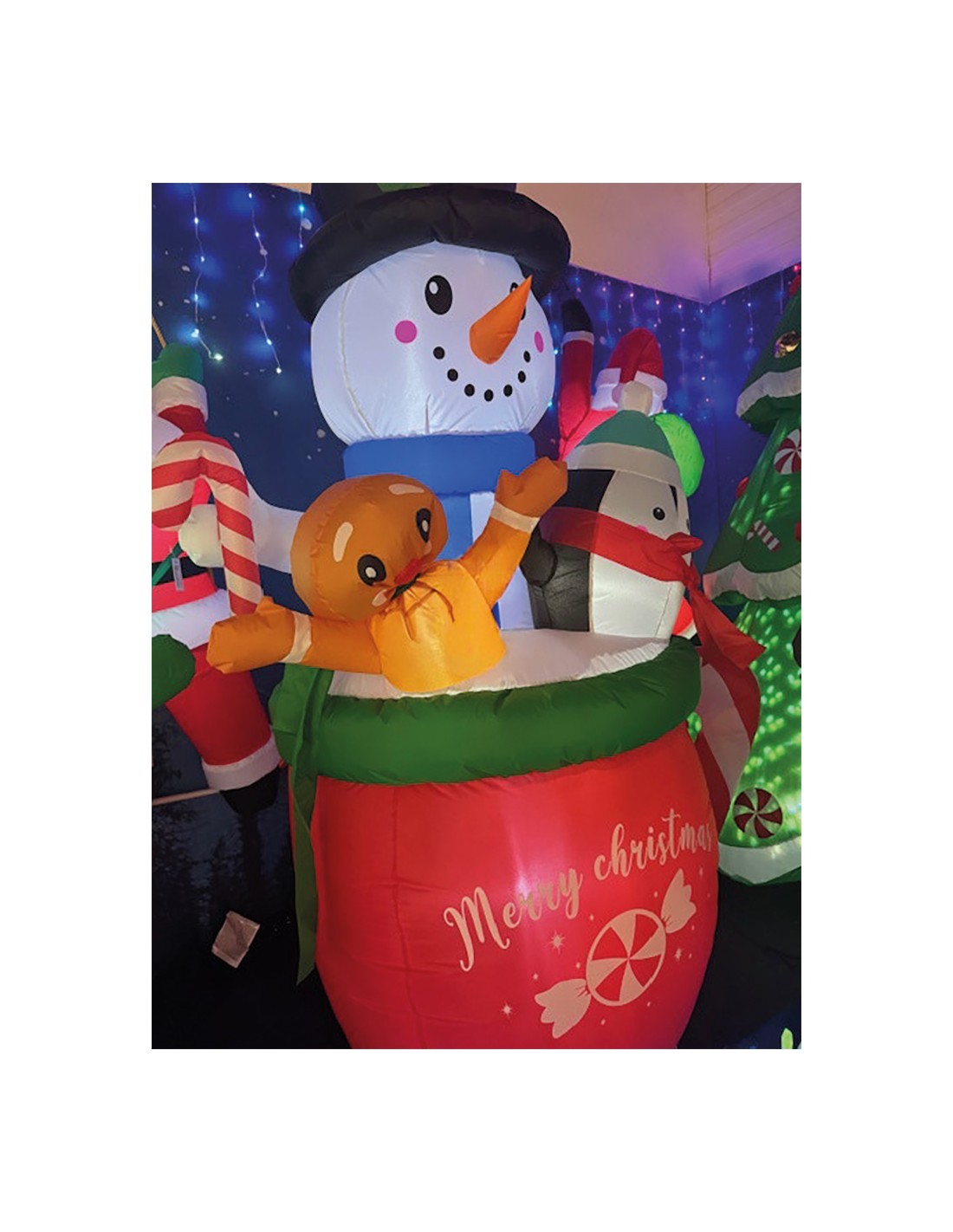 Muñeco de nieve hinchable en taza con pingüino y galleta de jengibre, con 2 x 3 + 2 x 1 leds, para interior y exterior ip44, 220 - 240 v ~50/60 hz, 8,6 w. tejido de poliéster con revestimiento impermeable, cable de 2 m, contiene 4 estacas de tierra y 2 ataduras. dimensiones 130 x 80 x 183 cm