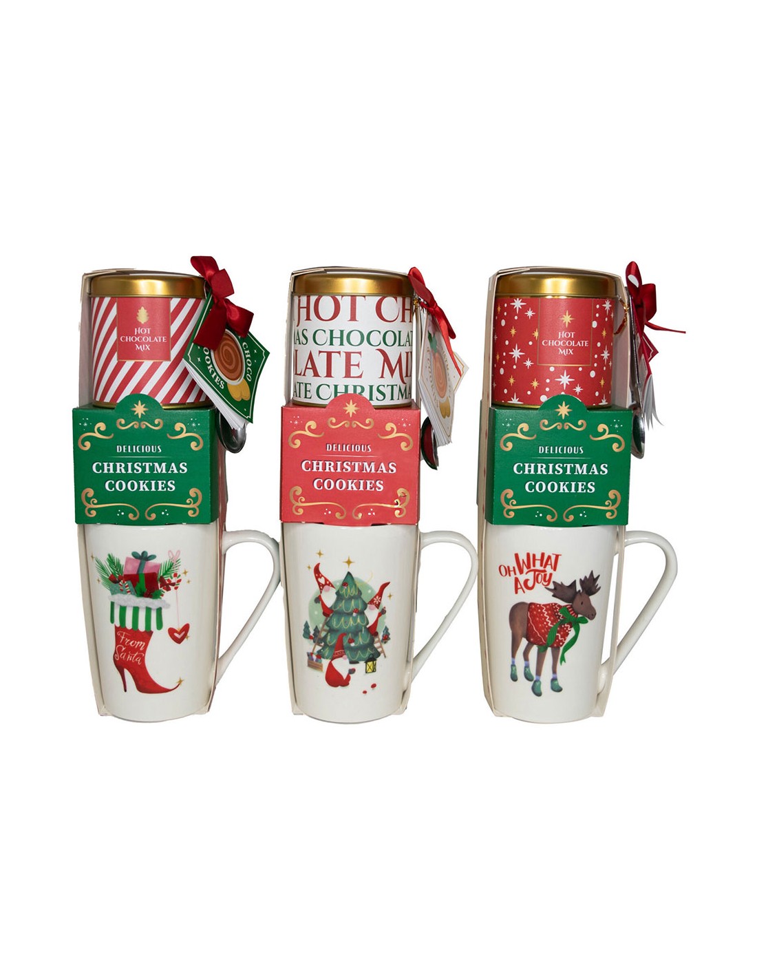 Taza con motivos navideños, contiene surtido de galletas sabor a mantequilla y chocolate en polvo para beber con sabor a vainilla. 3 modelos variados. dimensiones: 122 x 90 x 290 mm