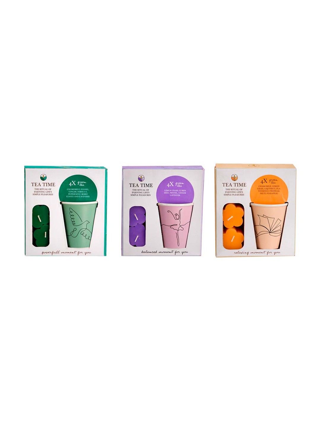 Taza wellness fine line con 4 bolsitas de té y 2 velas. modelos variados. 160 x 90 x 180 mm