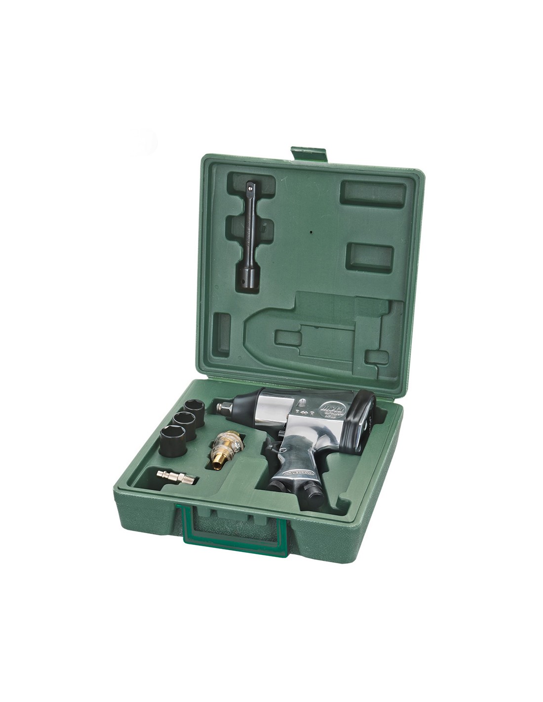 Llave de impacto 1/2 neumatica con kit. incluye: barra extension 20mm encastre de 1/2", bocallaves 17mm/19mm/21mm, lubricador de aceite automatico, acople racor macho de 1/4", maletin de transporte. max. rpm 7000, entrada de aire 1/4", presion de trabajo 6.5kg/cm (90ib/pul2). consumo aire 0.22m/min. max. torque: 32kg/m-230lb/ft. articulo con servicio tecnico mota, no se pueden hacer cambios, en caso de problema contactar con servicio tecnico mota 937.765.890 320n"