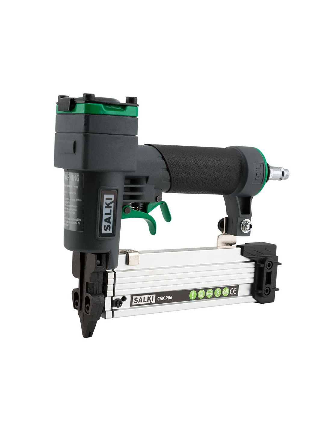 Clavadora neumática csk p06 expert 86900006 para madera y carpintería. consumible: pin 0,6/12 - 35mm. presión trabajo: 50 - 110 psi (3,5 - 7 bar). peso: 1,5kg. capacidad: 100 clavos. galga: ga23 (0,63mm). características: seguro incluido en gatillo. cargador de aluminio especial anticorrosión y antidesgaste.