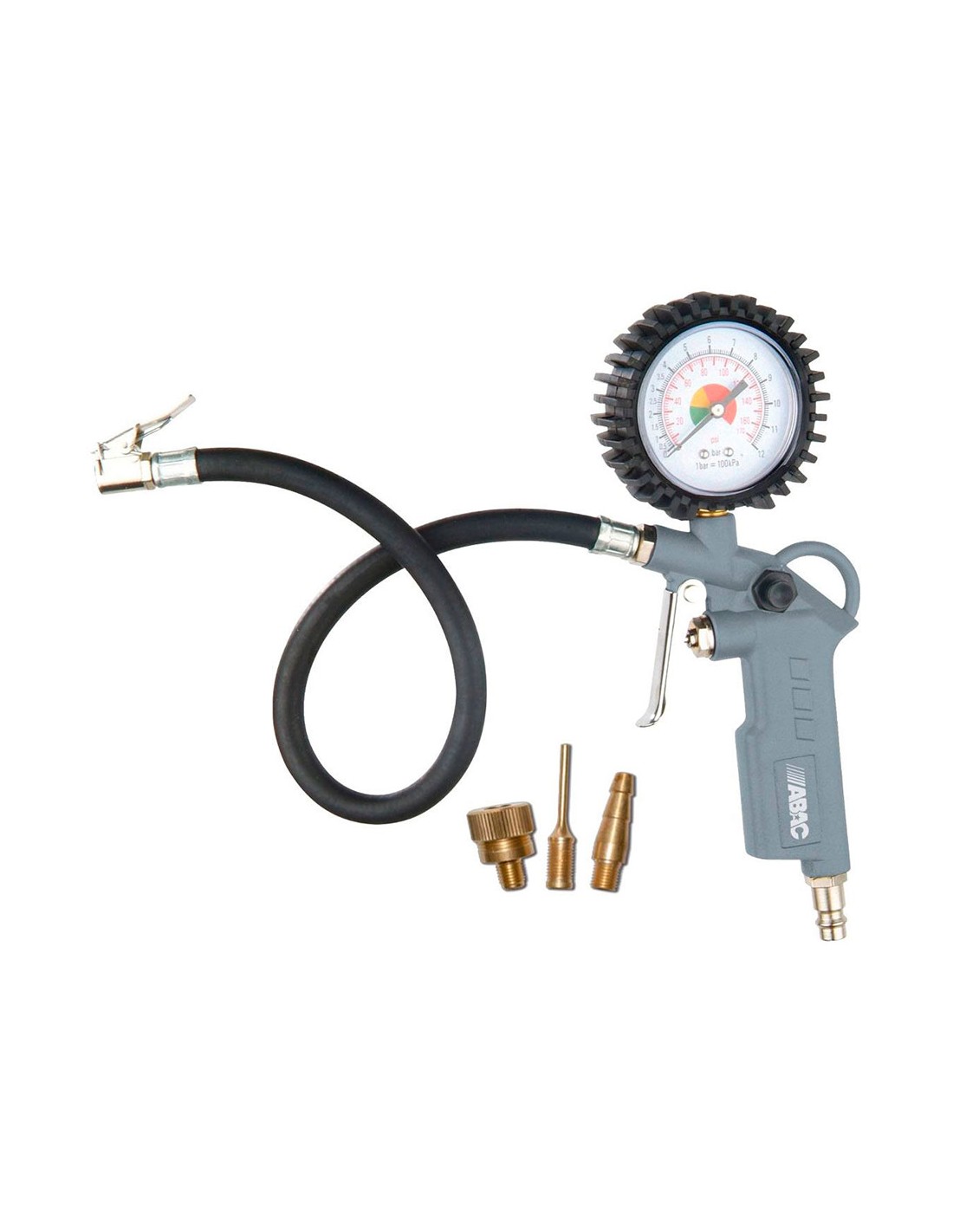 Pistola inflado con manómetro 0 - 8 bar para inflado de ruedas de coches y bicicletas, balones y botes, con kit de 3 adaptadores. escala de manómetro en bar y psi
