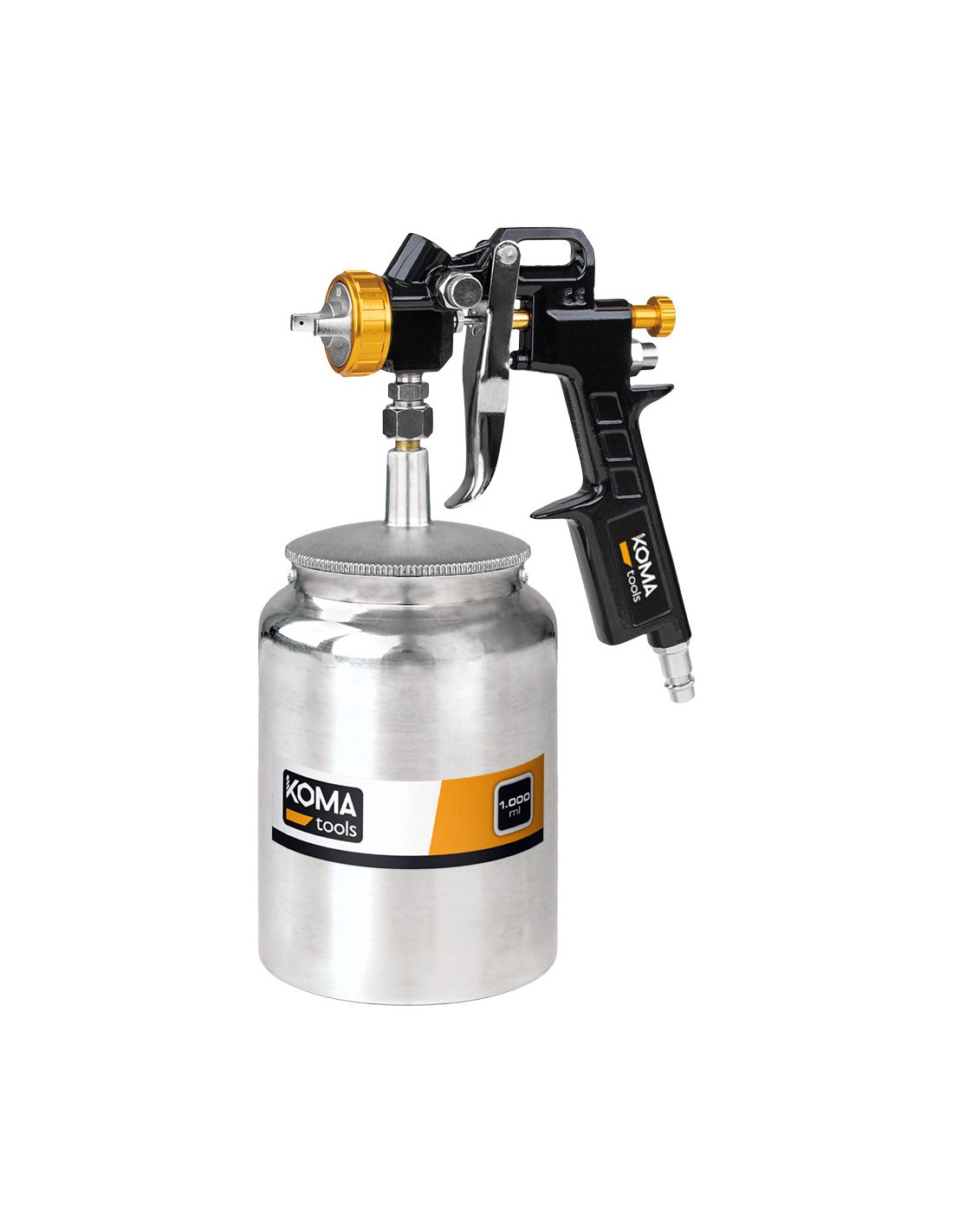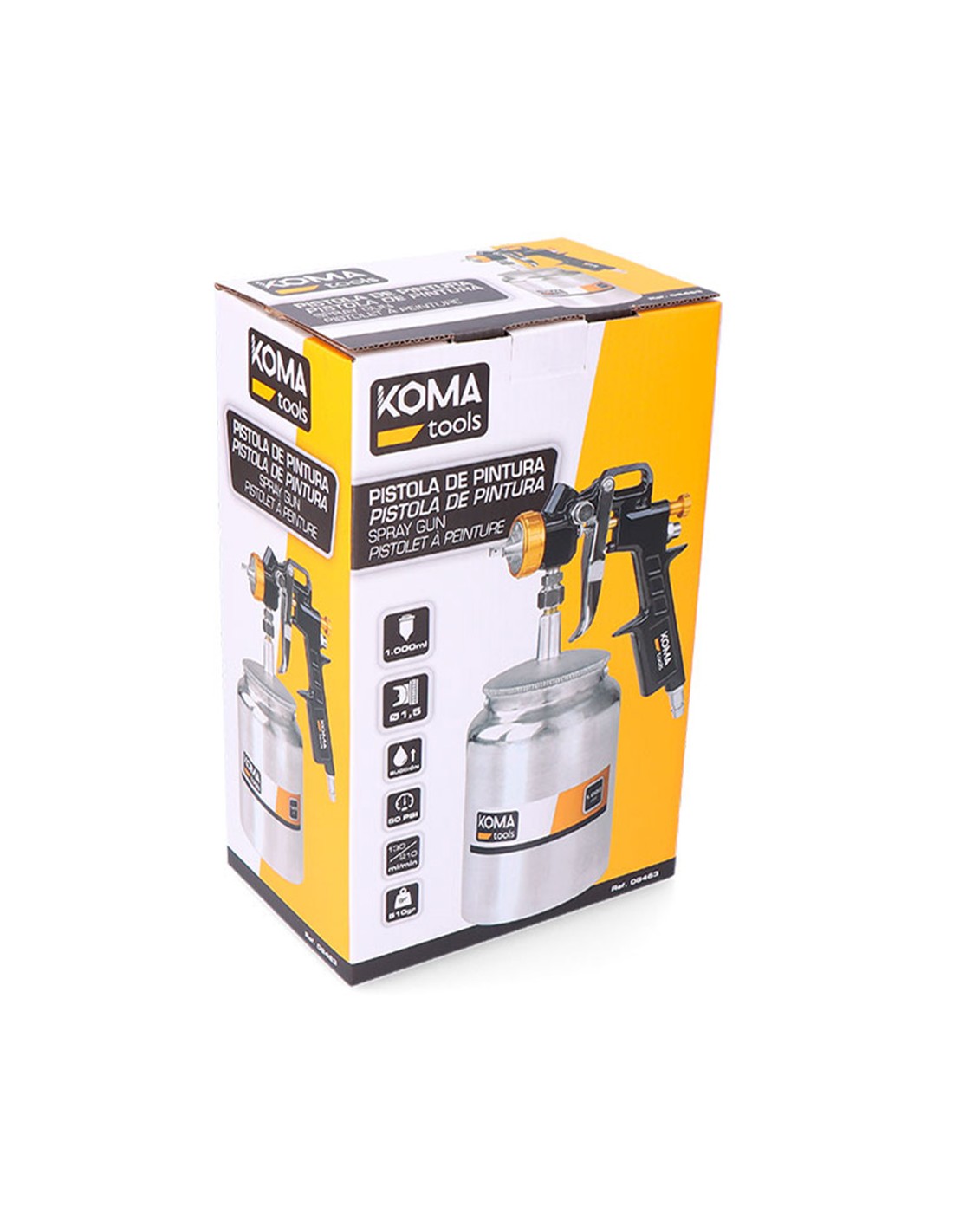 Pistola de pintura de succión, incluye: depósito capacidad de 1000 ml, llave polivalente, cepillo de limpieza. boquilla ø1,5 mm, admite entre 1,2 y 2,5 mm. consumo de aire 5-13,5 m/h, caudal 130 - 210 ml/min, toma de aire ¼. presión de trabajo 50 psi. peso del producto 510 gr, medidas: 10,4 x 16,8 x 25,5 cm"