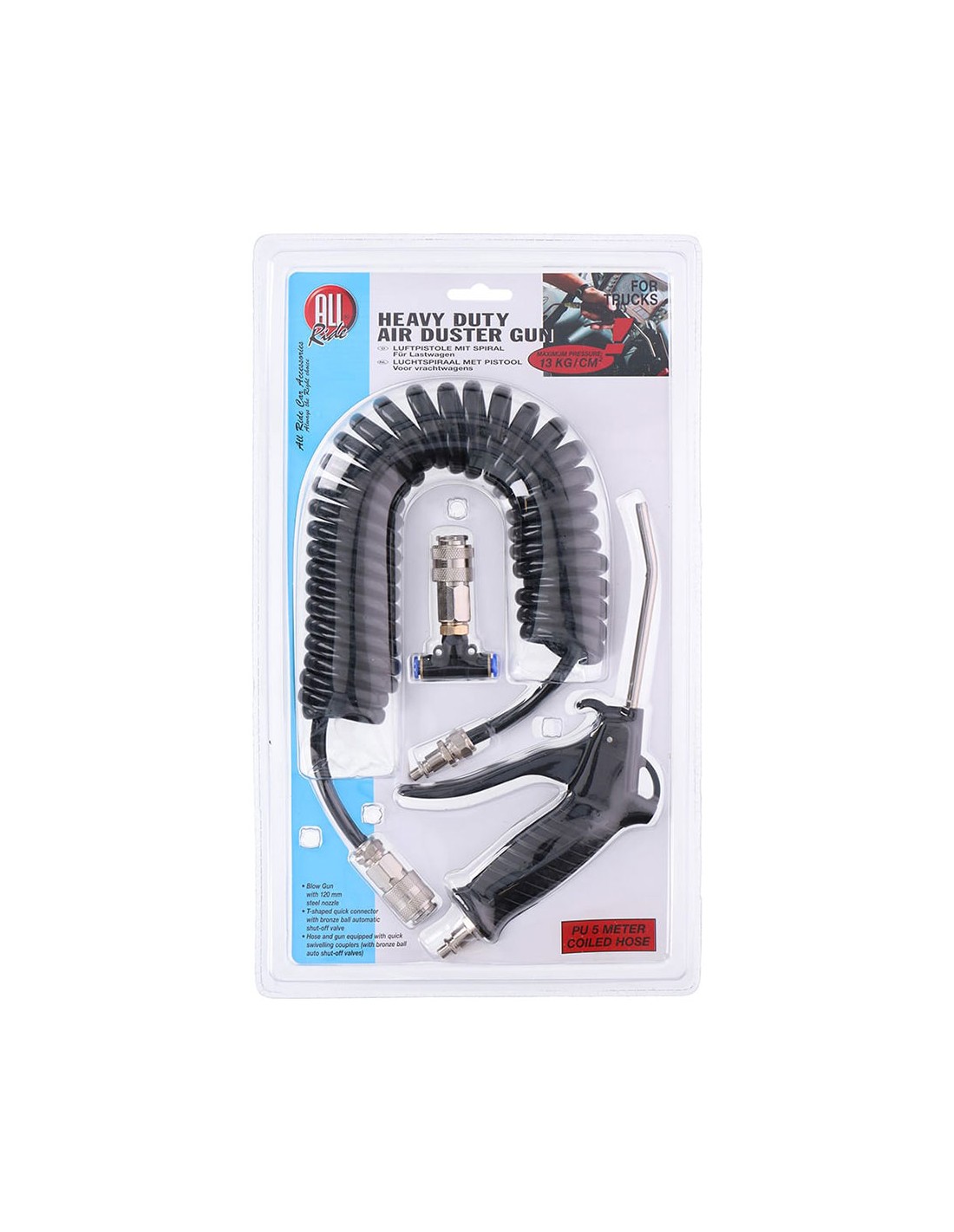 Kit de pistola de aire comprimido con boquilla de acero de 120 mm, conector rápido en forma de t con válvula de cierre automática de bola de bronce, manguera enrollada de 5 m, presión máxima - 13 kg / cm