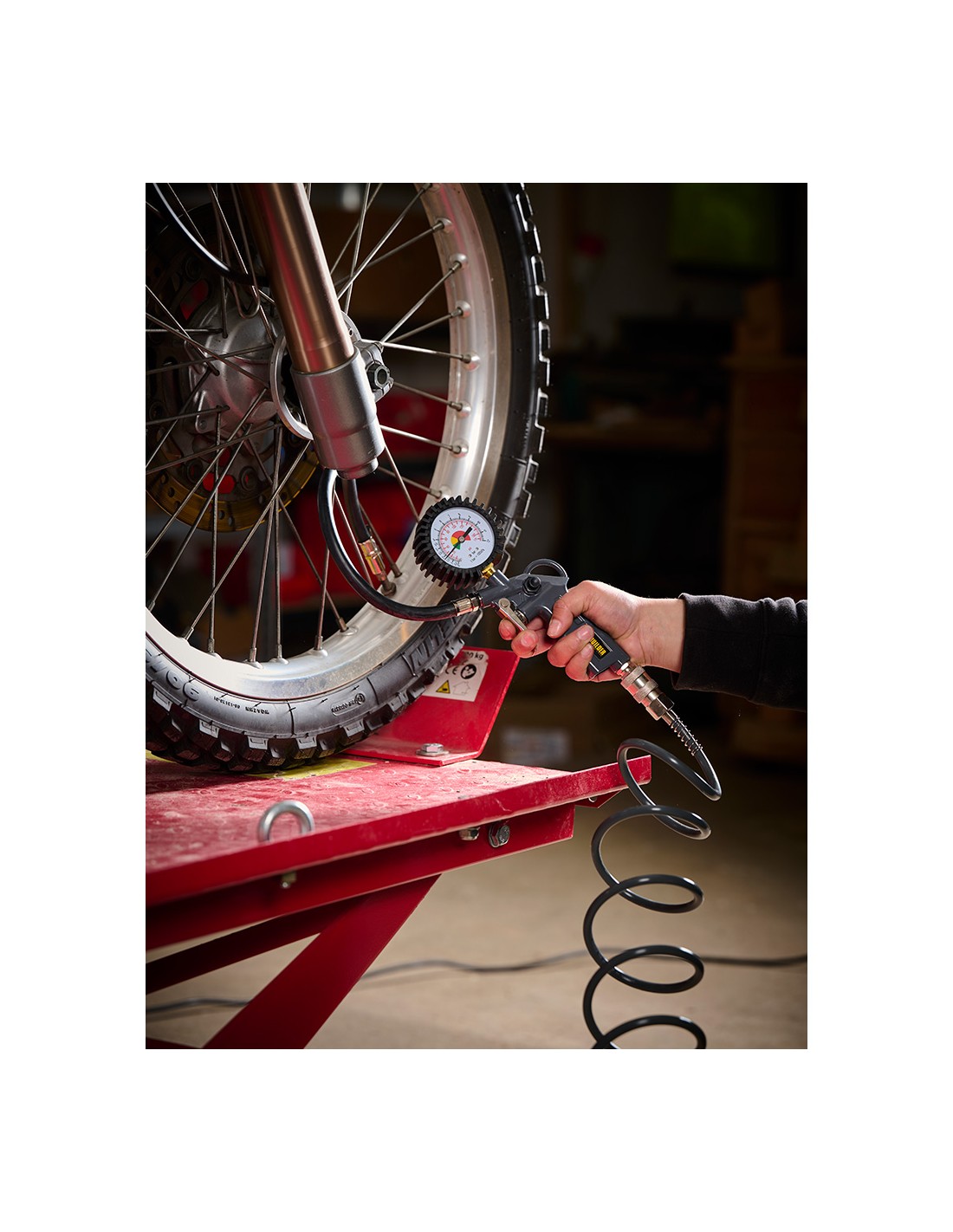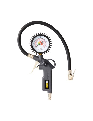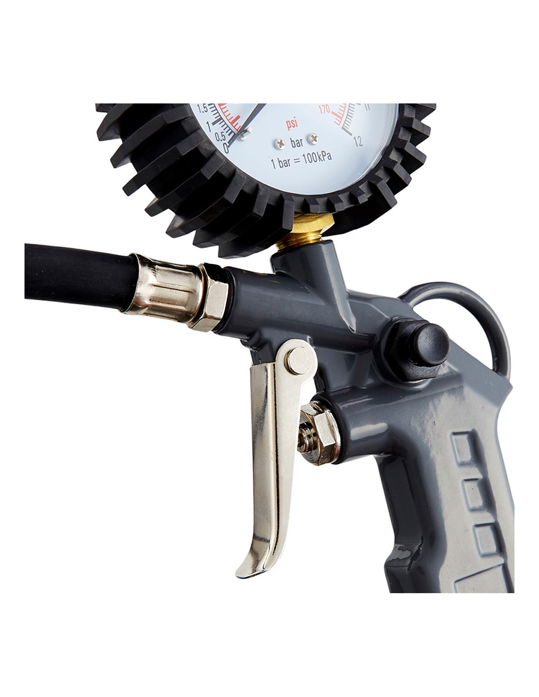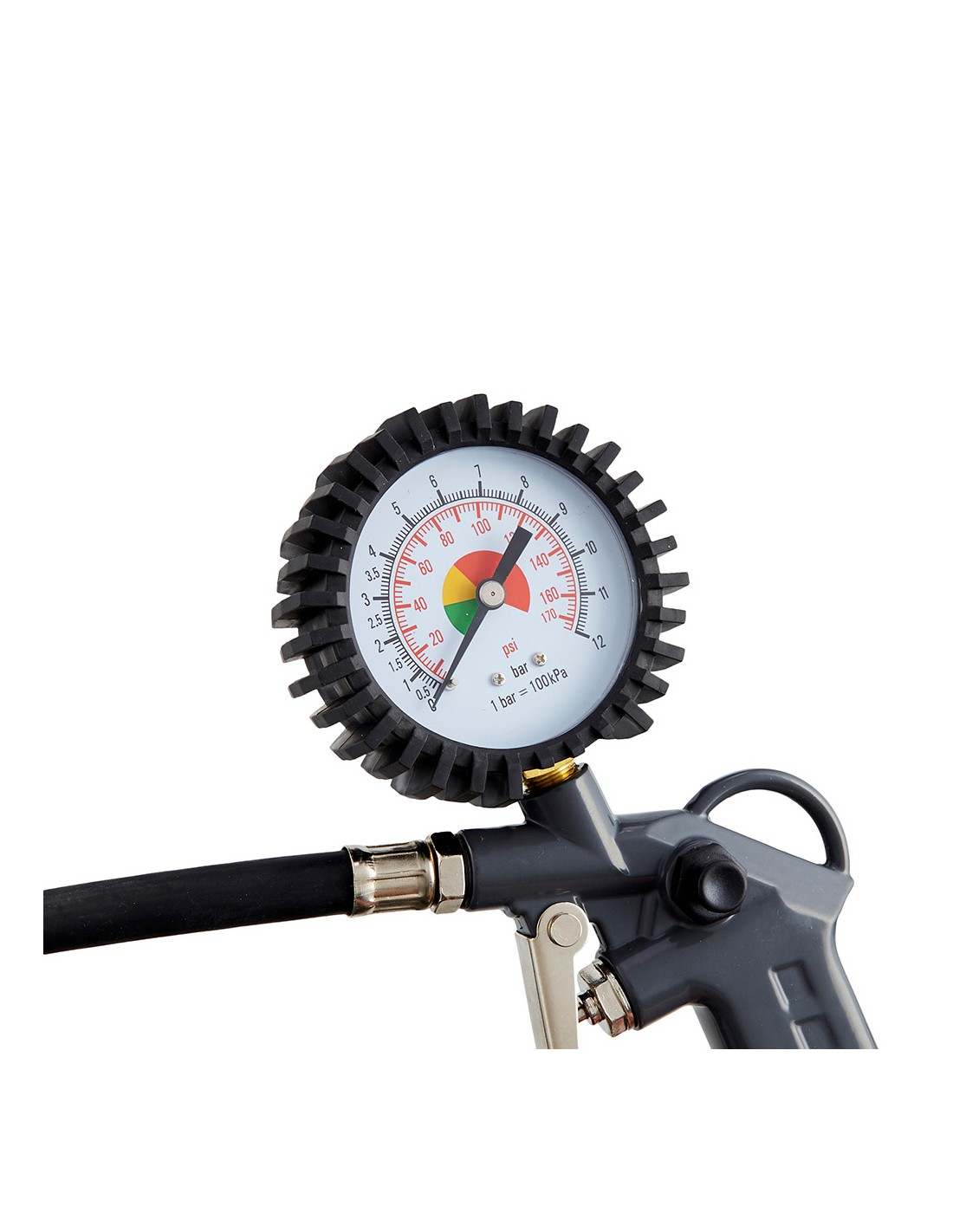 Pistola de inflado metálica con manómetro de 0 a 12 bar, escala psi: 174 libras, recubierto de goma protectora, tamaño boquilla 1/4", incluye boquilla de acoplamiento gris