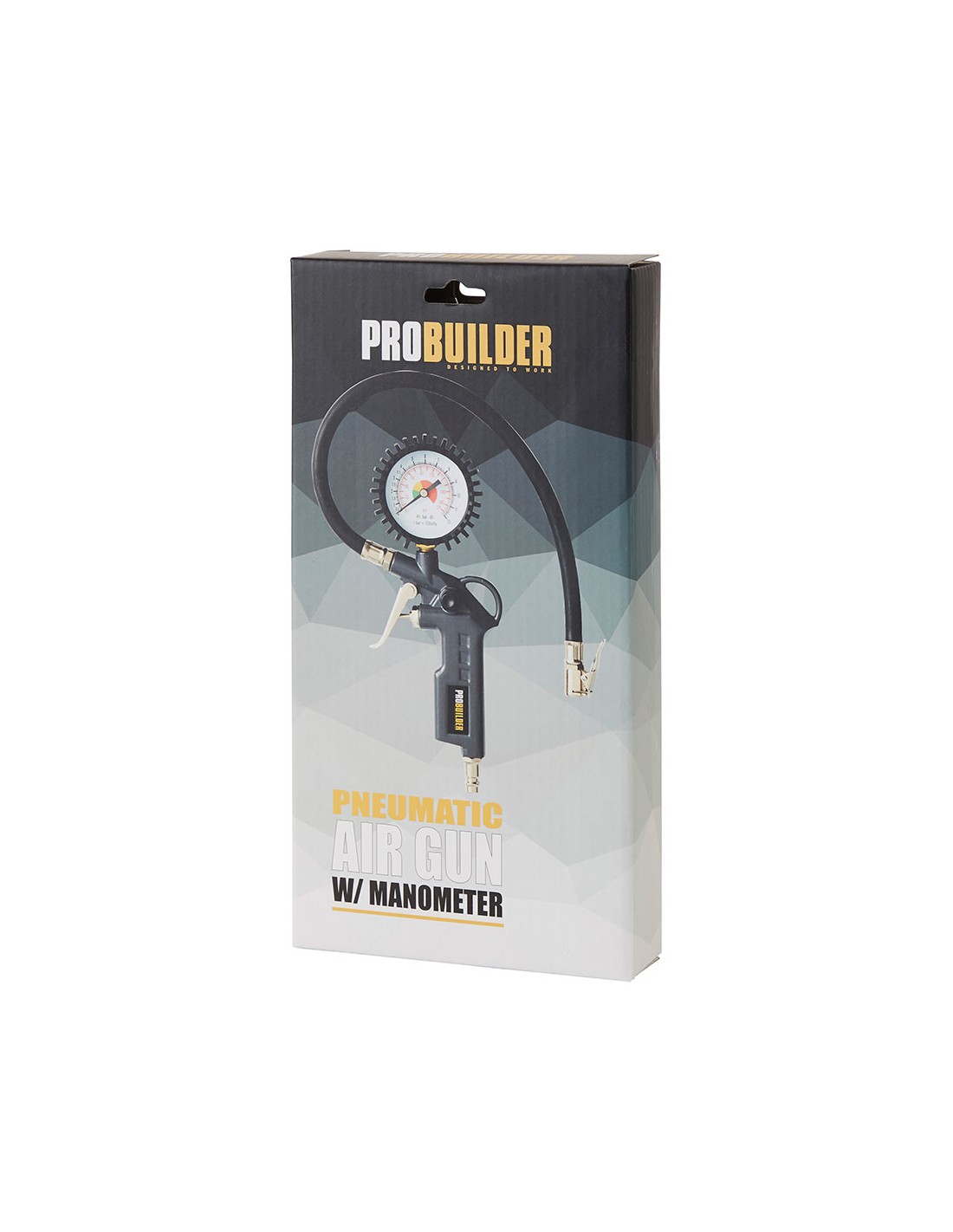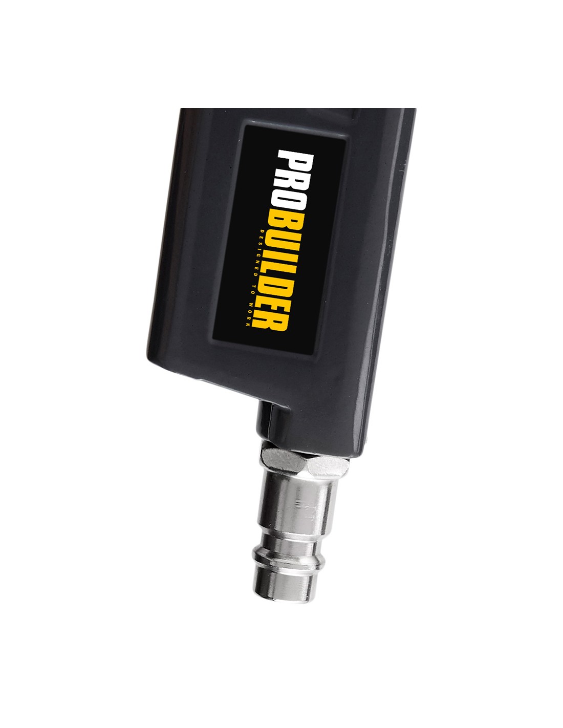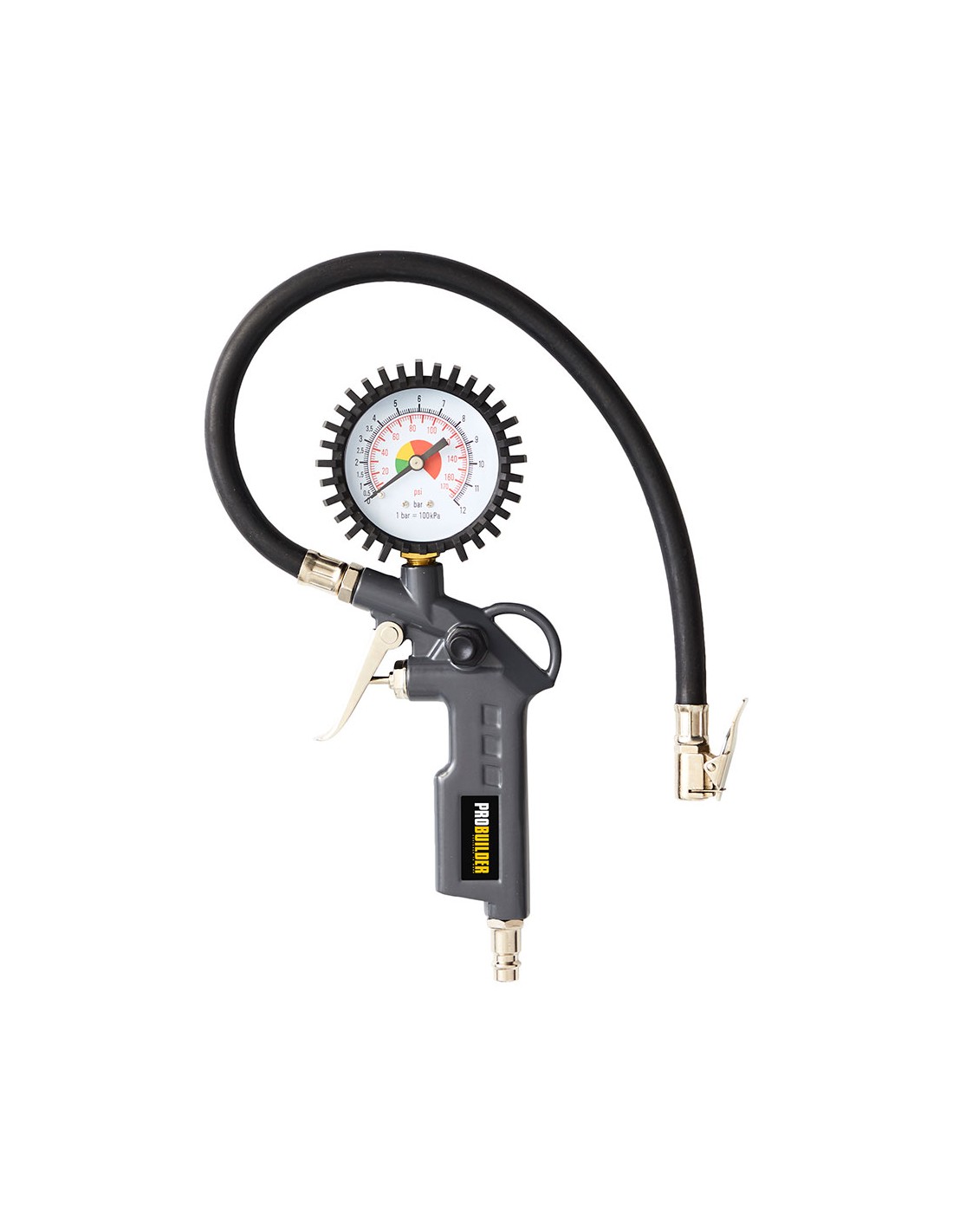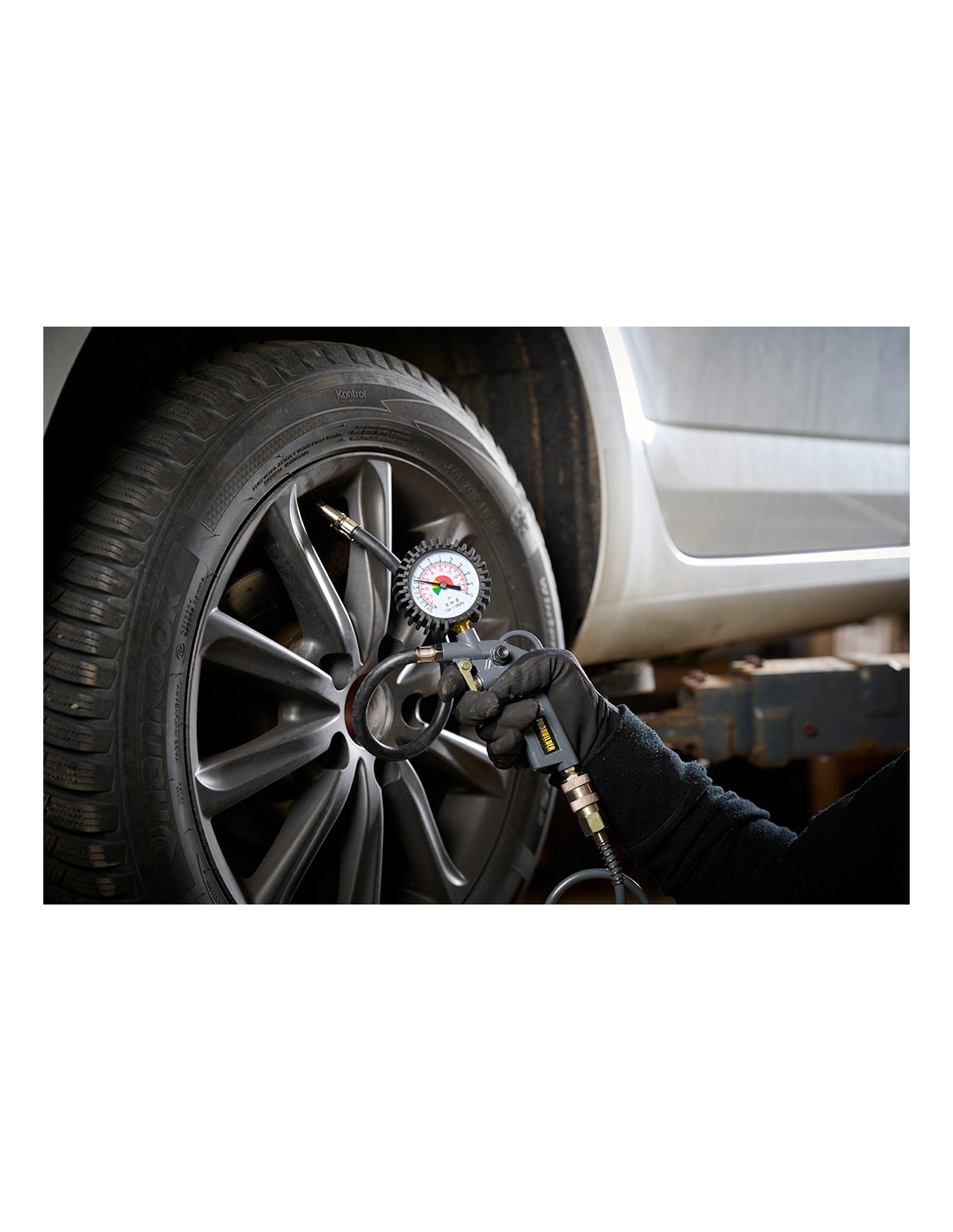 Pistola de inflado metálica con manómetro de 0 a 12 bar, escala psi: 174 libras, recubierto de goma protectora, tamaño boquilla 1/4", incluye boquilla de acoplamiento gris