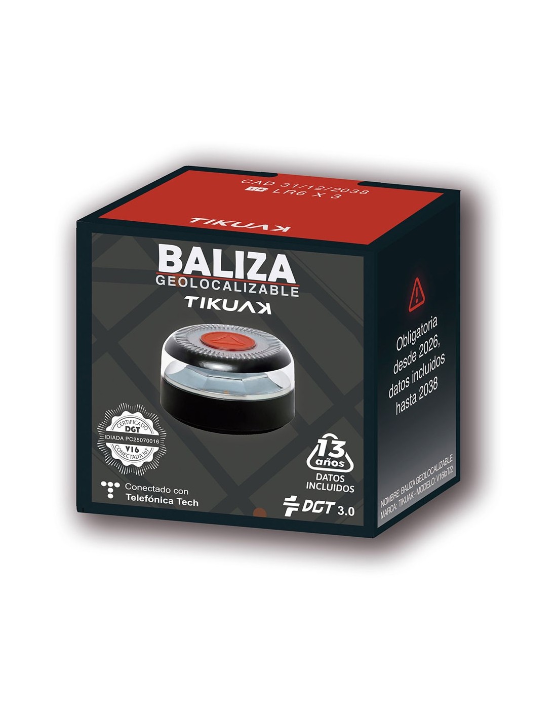 BALIZA V16 DE EMERGENCIA HOMOLOGADA CONECTADA GEOLOCALIZABLE CON DGT 3.0 TIKUAK; SIM VALIDA HASTA 31/12/2038; IP54, MÁXIMO SEIS HORAS DE AUTONOMÍA, MAGNÉTICA, FUNCIONA CON 3 PILAS AA INCLUIDAS; 50,6 x 86,8 mm