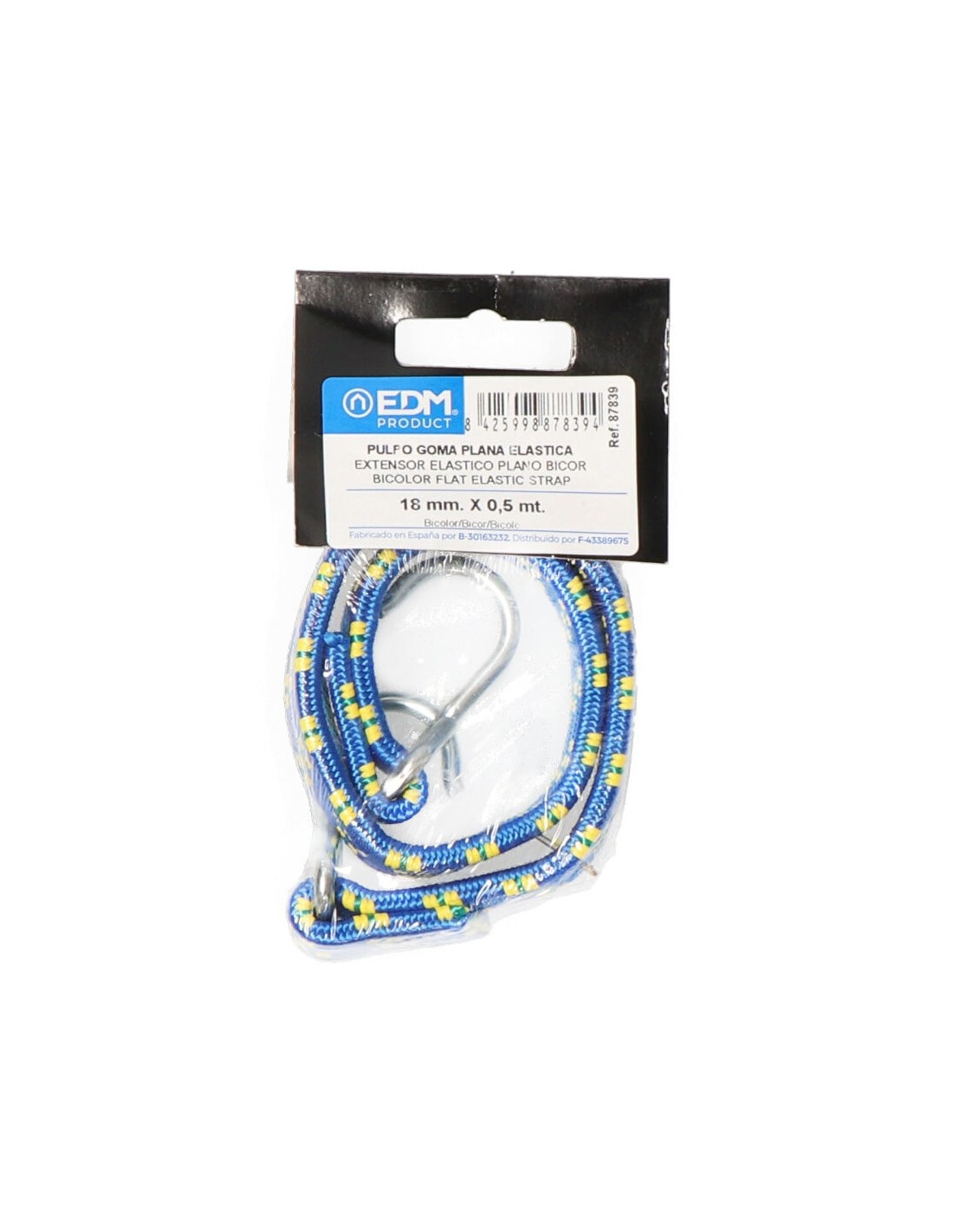 Pulpo de goma plano bicolor 0,5m. colores surtidos. composicion: cinta polipropileno alta tenacidad con proteccion solar y goma latex de alto modulo. maxima elasticidad: 100%. fabricado en españa. resistencia cinta: 500kg. aprox. resistencia gancho a deformacion: 100kg. aprox y resistencia cosido: 350. colores / modelos surtidos