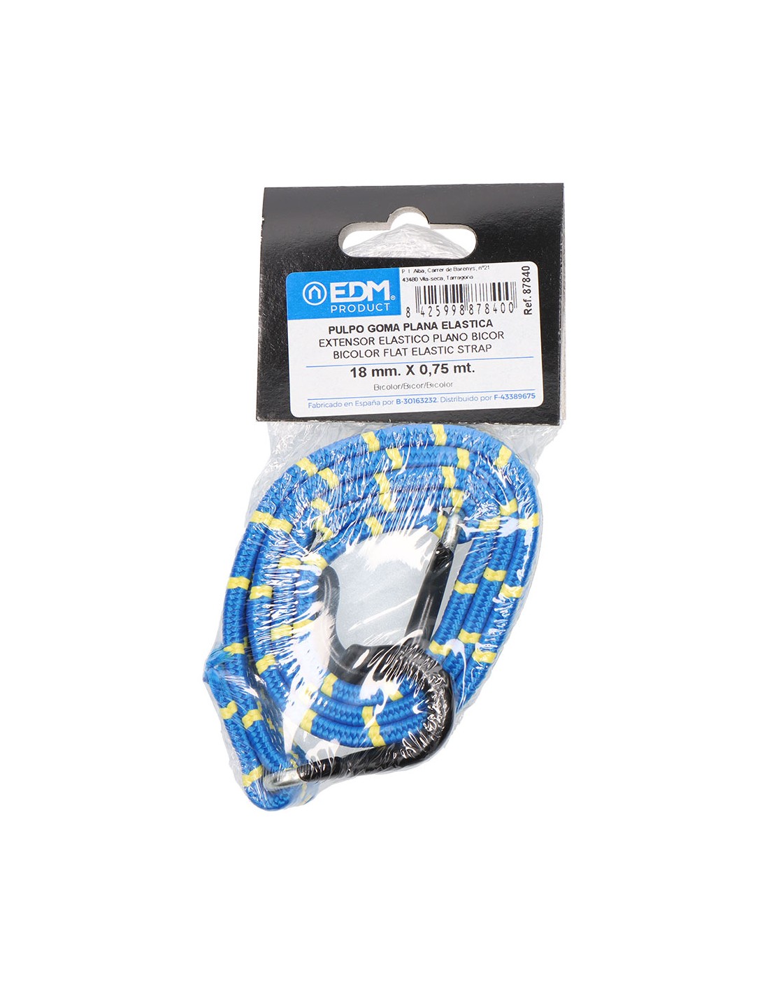 Pulpo goma plano bicolor 0,75m. colores surtidos.composicion: cinta polipropileno alta tenacidad con proteccion solar y goma latex de alto modulo. maxima elasticidad: 100%. fabricado en españa. resistencia cinta: 500kg. aprox. resistencia gancho a deformacion: 100kg. aprox y resistencia cosido: 350. colores / modelos surtidos