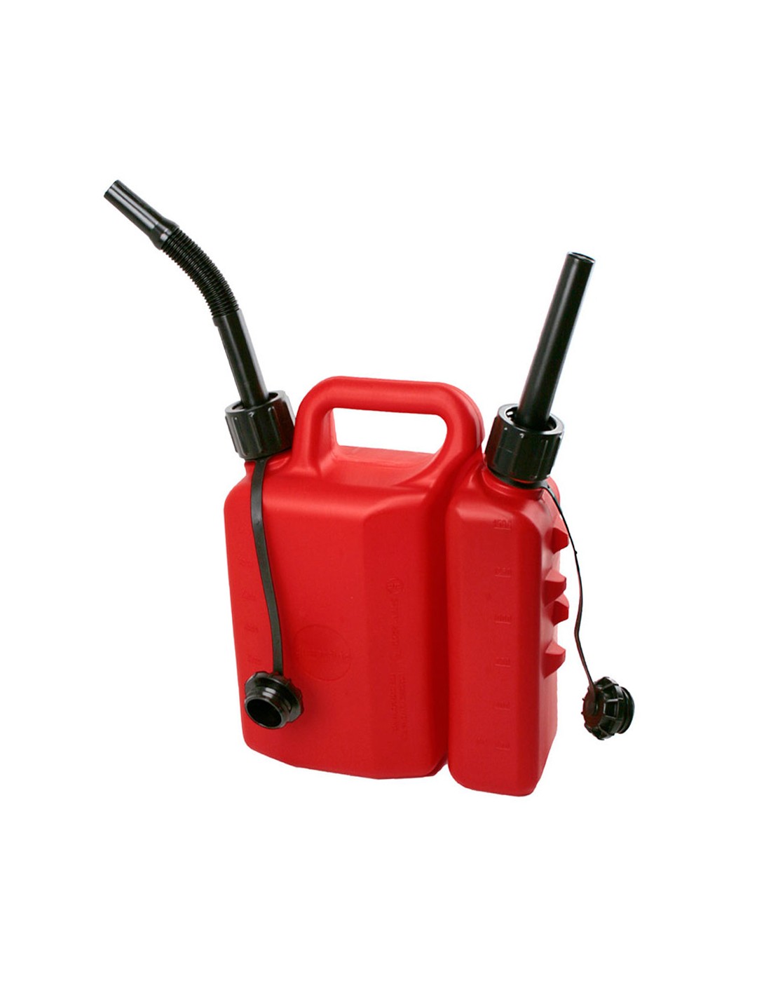 Bidón con doble depósito de 3,5 l + 1,5 l con 2 boquillas: 1 flexible y 1 rígida 7030 di martino con sistema de vertido nogorgle certificados para el transporte terrestre, marítimo, aéreo y carretera el dispensador tiene dos salidas que permiten la salida continua del líquido sin desbordamiento. los tapones tienen juntas especiales adecuadas para estar en contacto con los distintos tipos de hidrocarburos