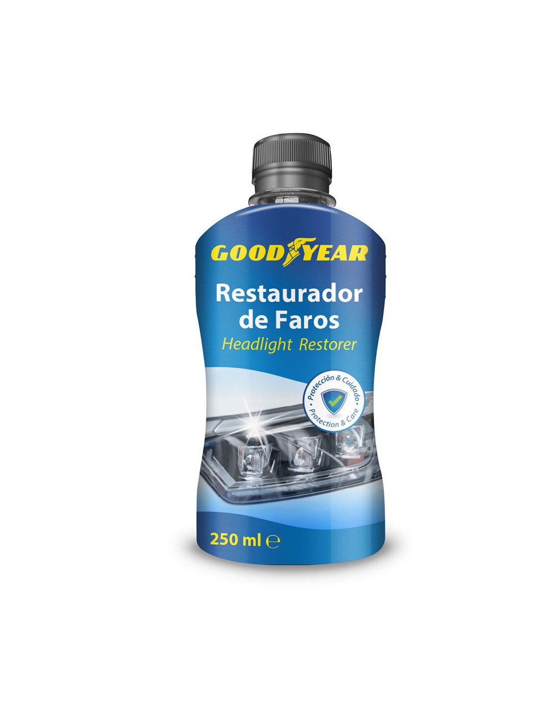 Reparador faros goodyear 250ml gy31cl250 goodyear producto utilizado para restaurar faros opacos y amarillentos, dándoles apariencia de nuevos. limpia la superficie exterior de la cola y los faros dándoles su brillo y transparencia originales. no es necesario utilizar una máquina pulidora ni papel de lija. dimensiones: 16x15x12cm, peso 1,328kg la caja