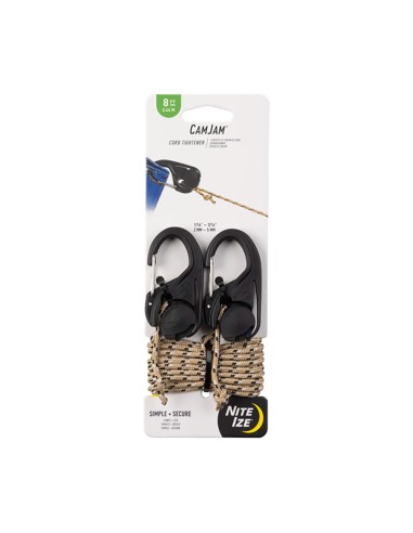 Pack 2 reemplazanudos con cordón 2,44m para diametro cordel entre 2 y 5mm, diseñado para bloquear de forma segura en su lugar con un simple tirón de una cuerda, el nite ize camjam es una manera fácil y sin nudos para apretar, tensar y asegurar cargas ligeras de todo tipo. fabricado en plástico resistente y duradero, cuenta con un mosquetón con una compuerta de acero inoxidable en un extremo y un mecanismo de leva giratorio y estriado en el otro. basta con anclar el mosquetón a cualquier gancho, anilla en d o bucle, y pasar el cordón por la leva hasta alcanzar el nivel de tensión deseado. tire con firmeza, y la leva se bloqueará en su sitio y permanecerá así hasta que la suelte girando la leva. fácil de ajustar y reajustar, el camjam está hecho para usarse y reutilizarse cientos de veces, de cientos de maneras. enganchado a anillas y ganchos, es excelente para colgar y asegurar lonas, tiendas de campaña, persianas, equipos (¡perfecto para bolsas de oso!). crea un bucle enganchándolo a un extremo de la cuerda y tirando del otro para atar sacos de dormir, mantas, cortar maleza o envolver cargas ligeras en carretillas, carros, carritos, bicicletas y barcos. nite ize