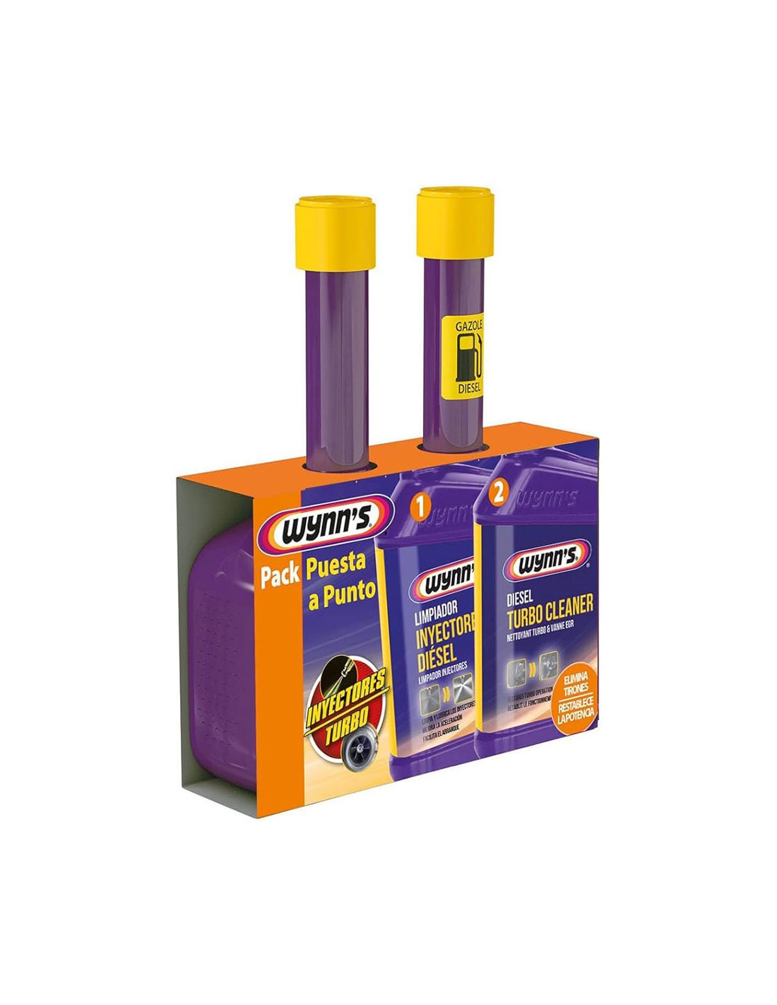 Pack de ajuste. se compone de limpiador de inyectores diésel y limpiador de turbo diésel. contiene: 325 ml + 325 ml. recupera las máximas prestaciones. limpia los inyectores y restablece la pulverización original, mejora la calidad de ignición. limpia y libera los álabes mejorando la combustión y el funcionamiento del turbo.
