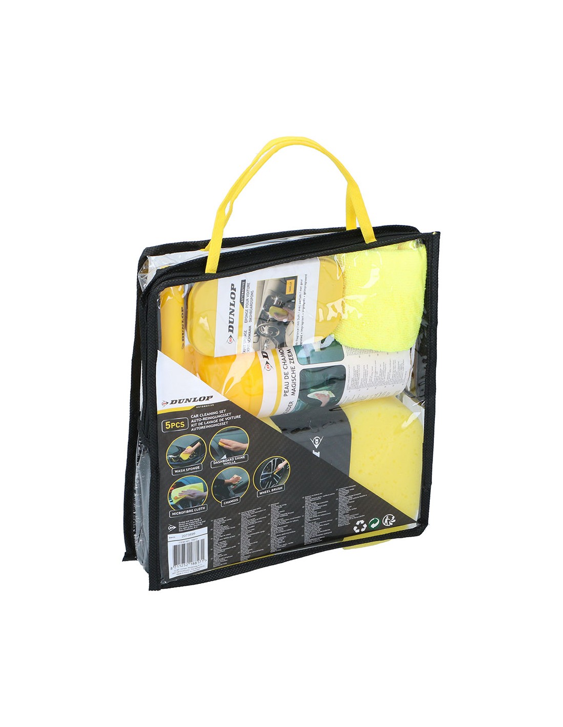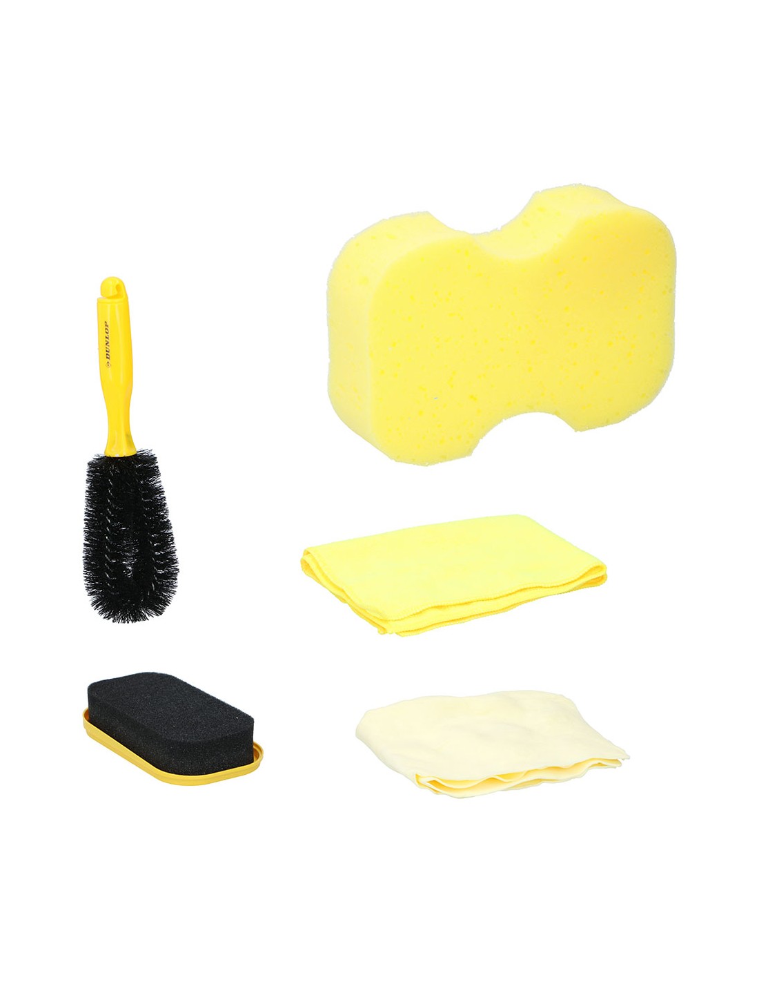 Set de limpieza para coche. incluye 5 piezas: esponja de lavado, abrillantador para salpicadero con olor a vainilla, bayeta de microfibra, gamuza y cepillo para llantas