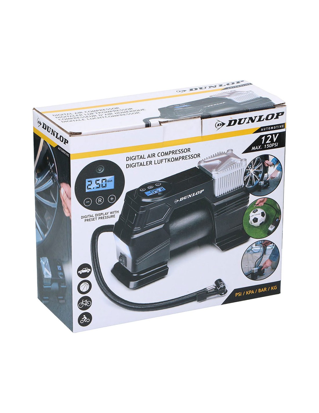 Compresor 12 v con pantalla digital, incluye 3 adaptadores, manguera de aire de 60 cm, cable de alimentación de 3 m con enchufe encendedor de coche con fusible, presión máxima 150 psi, dimensiones 20,5 x 8 x 13 cm